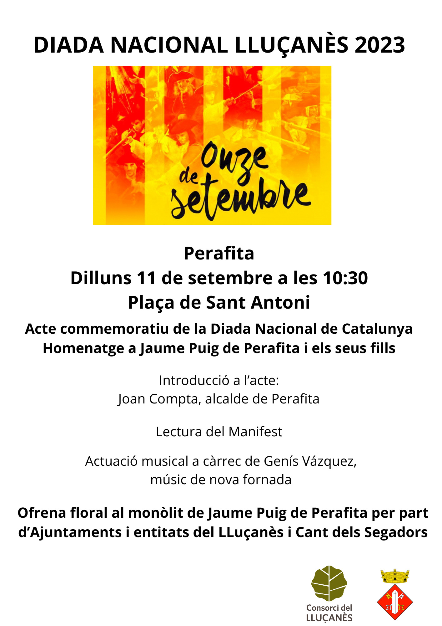 El proper dilluns 11 de setembre, a partir de dos quarts d’onze del matí, se celebrarà la tradicional commemoració de la Diada Nacional de Catalunya al Lluçanès, a Perafita, amb l’Homenatge a Jaume Puig i els seus fills.