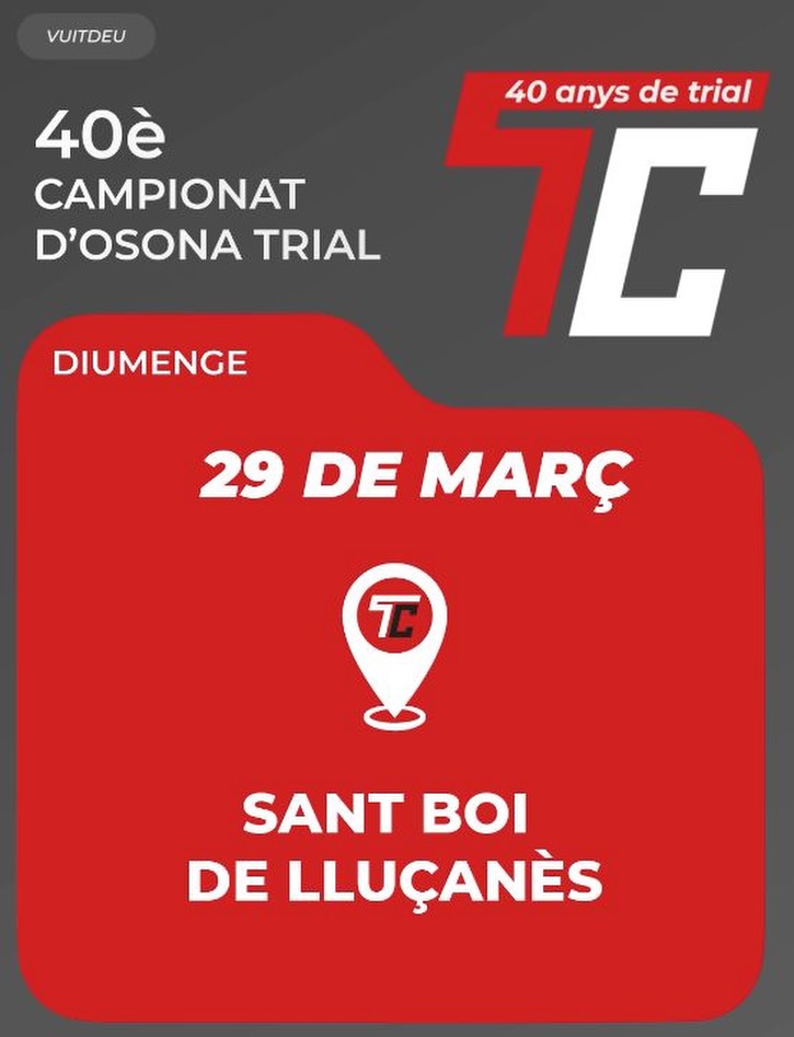 Data/es 29 març 2026 40è Campionat d’Osona Trial (COTA) a Sant Boi de Lluçanès Compartir a + Afegir a calendari de Google + Afegir iCal / Outlook
