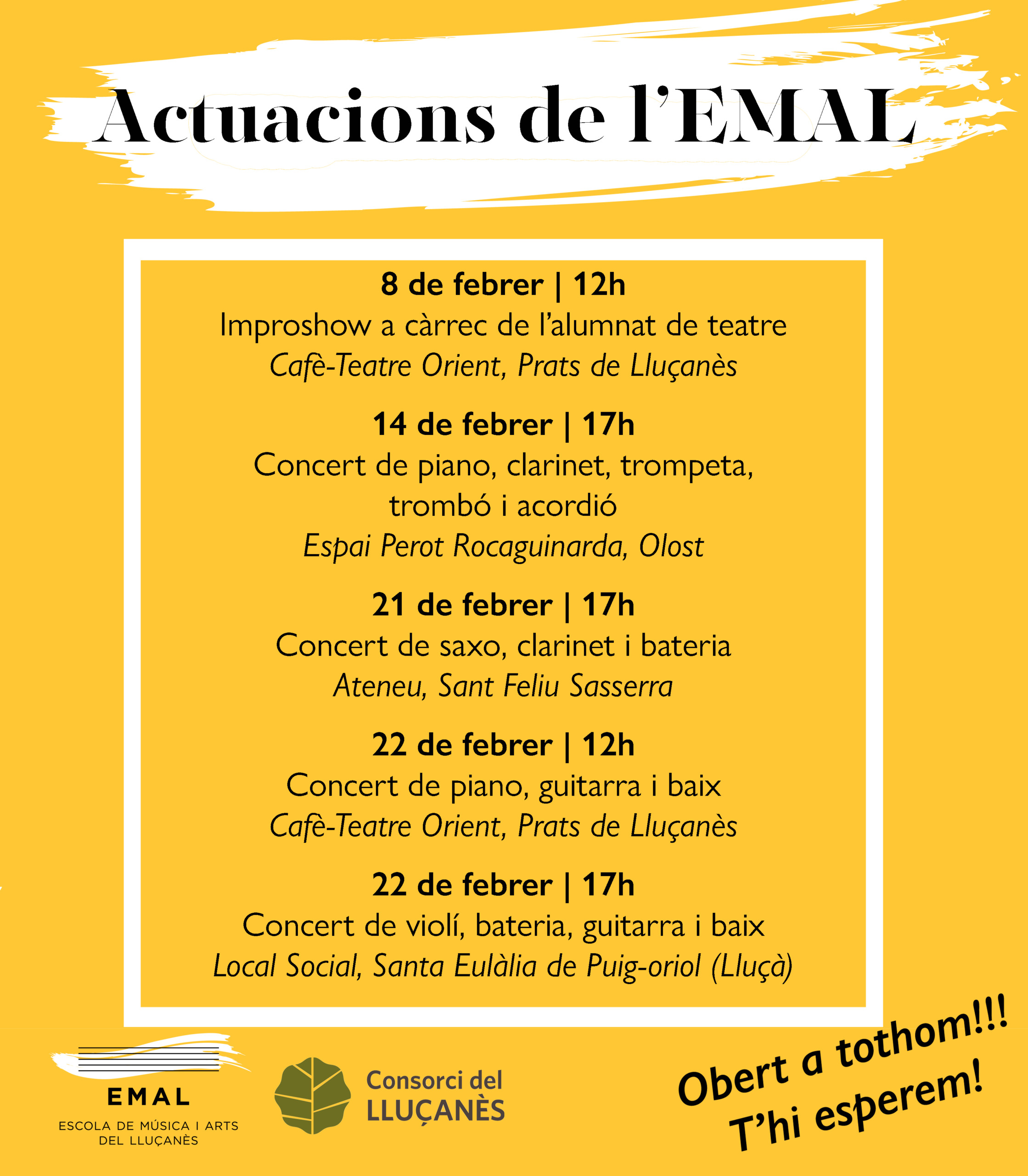 Data/es 22 febr. 2026 Expired! Hora 17:00 Concert de violí, bateria, guitarra i baix: Alumnes EMAL Compartir a + Afegir a calendari de Google + Afegir iCal / Outlook