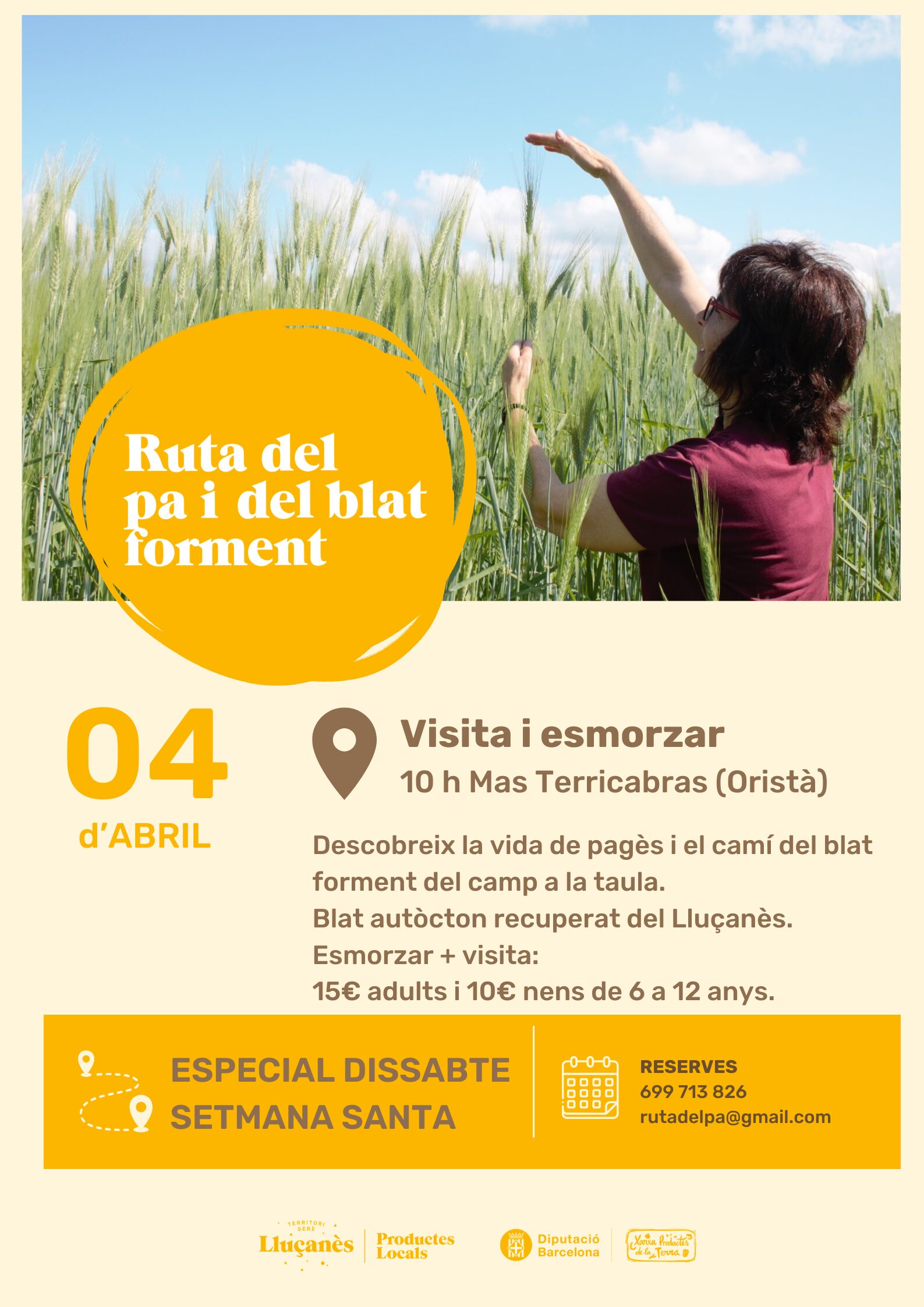 Data/es 04 abr. 2026 Hora 10:00 Ruta del pa i del blat forment: Visita i esmorzar a Mas Terricabras Compartir a + Afegir a calendari de Google + Afegir iCal / Outlook