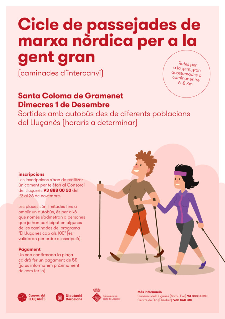 La Diputació de Barcelona juntament amb els municipis participants inicien de nou el projecte d’intercanvis entre municipis de la província de Barcelona del Cicle de Passejades de marxa nòrdica per a gent gran. Per aquest 2021-22 compartirem les sortides amb els grups de Santa Coloma de Gramenet, Calella, el Lluçanès i Sant Andreu de la Barca.