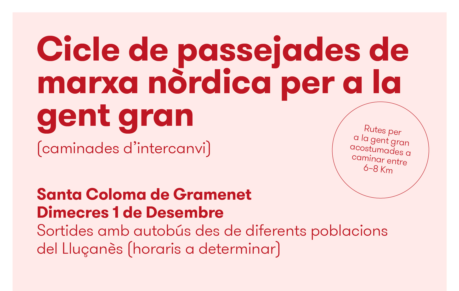 Les sortides estan destinades a persones acostumades a caminar de forma regular entre 7-9 Km i es practicarà la marxa nòrdica, és per això que recomanem que cadascú es porti els seus pals, en cas de no disposar-ne en tenim alguns parells disponibles.