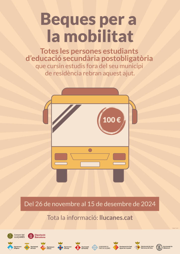 El Consorci del Lluçanès, a través de les àrees d’Educació i Joventut, obre una convocatòria de beques per a la mobilitat dels i les estudiants d’educació secundària post obligatòria en les quals hi podran accedir tots aquells joves empadronats als municipis d’Alpens, Lluçà, Olost, Oristà, Perafita, Prats de Lluçanès, Sant Agustí de Lluçanès, Sant Bartomeu del Grau, Sant Boi de Lluçanès, Sant Feliu Sasserra, Sant Martí d’Albars i Sobremunt que cursin els seus estudis de Batxillerat, Cicle formatiu, Certificat de professionalitat, Programa de Formació i inserció o Itinerari Formatiu específic a un municipi diferent i en qualsevol àmbit territorial durant el curs 2024-2025.