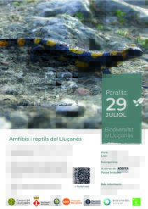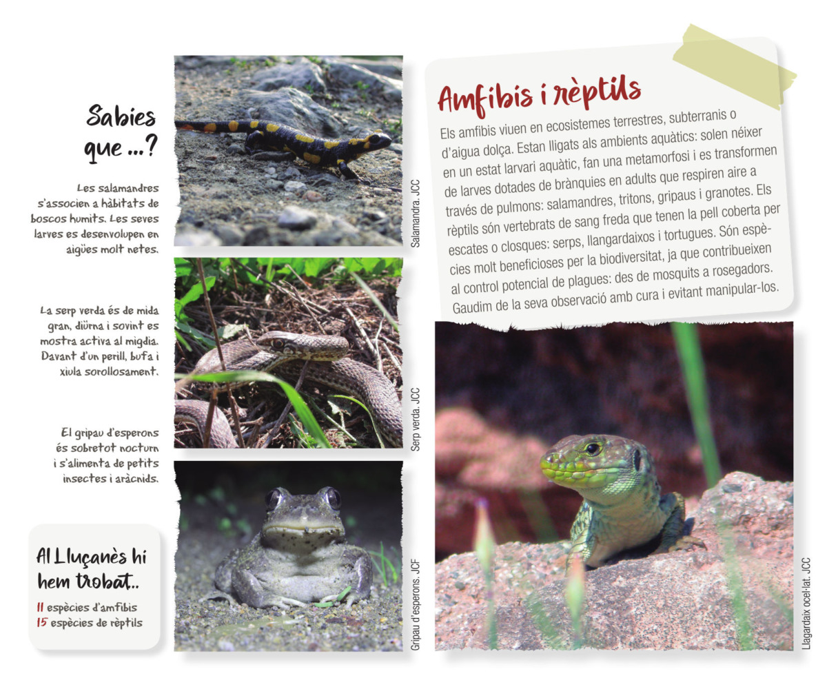 Els amfibis viuen en ecosistemes terrestres, subterranis o d’aigua dolça. Estan lligats als ambients aquàtics: solen néixer en un estat larvari aquàtic, fan una metamorfosi i es transformen de larves dotades de brànquies en adults que respiren aire a través de pulmons: salamandres, tritons, gripaus i granotes. Els rèptils són vertebrats de sang freda que tenen la pell coberta per escates o closques: serps, llangardaixos i tortugues. Són espècies molt beneficioses per la biodiversitat, ja que contribueixen al control potencial de plagues: des de mosquits a rosegadors. Gaudim de la seva observació amb cura i evitant manipular-los.