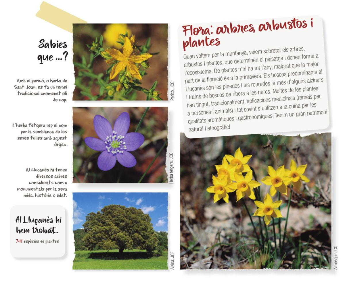 Quan voltem per la muntanya, veiem sobretot els arbres, arbustos i plantes, que determinen el paisatge i donen forma a l’ecosistema. De plantes n’hi ha tot l’any, malgrat que la major part de la floració és a la primavera. Els boscos predominants al Lluçanès són les pinedes i les rouredes, a més d’alguns alzinars i trams de boscos de ribera a les rieres. Moltes de les plantes han tingut, tradicionalment, aplicacions medicinals (remeis per a persones i animals) i tot sovint s’utilitzen a la cuina per les qualitats aromàtiques i gastronòmiques. Tenim un gran patrimoni natural i etnogràfic!