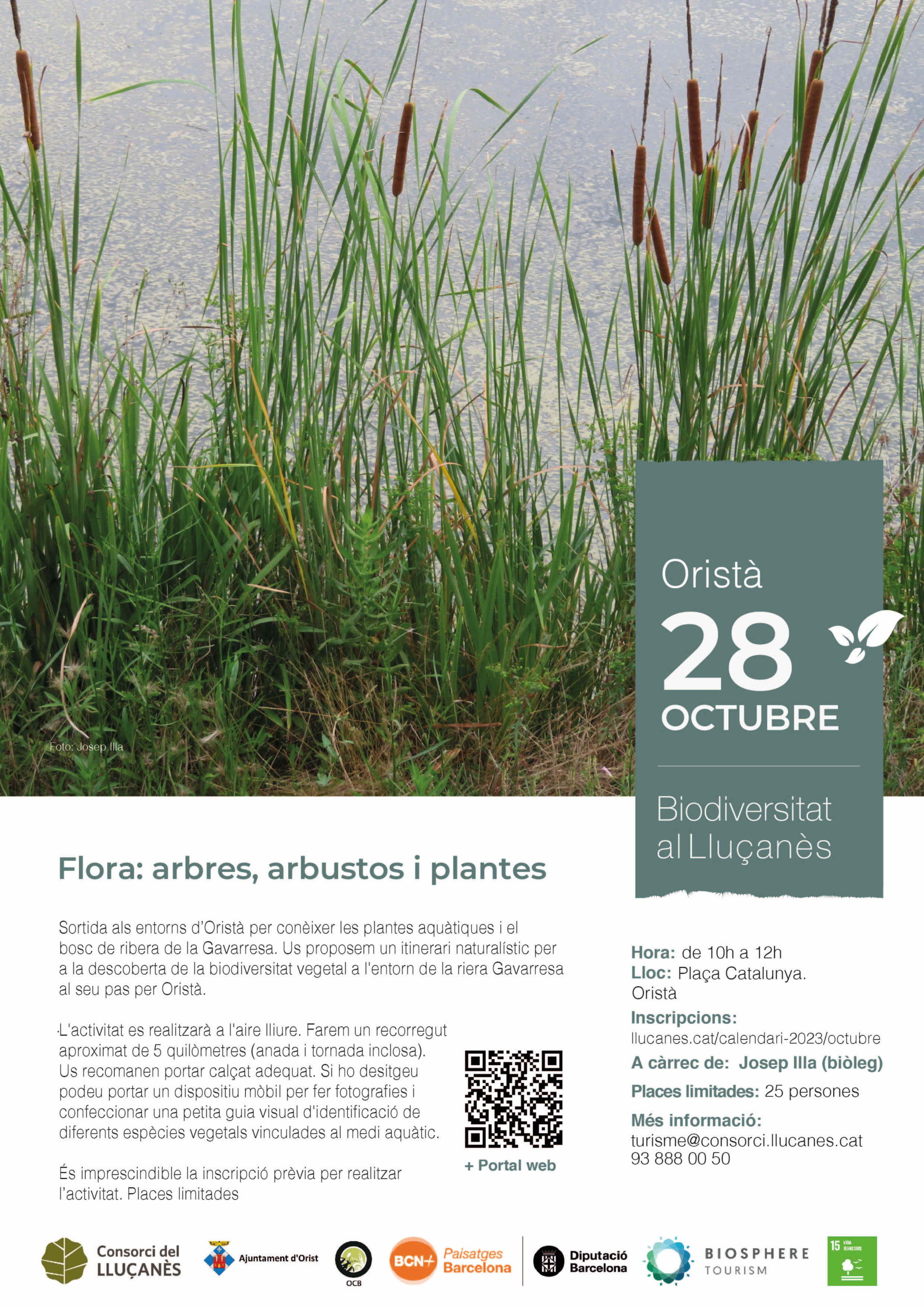 L’activitat es realitzarà a l’aire lliure. Farem un recorregut aproximat de 5 quilòmetres (anada i tornada inclosa). Us recomanen portar calçat adequat. Si ho desitgeu podeu portar un dispositiu mòbil per fer fotografies i confeccionar una petita guia visual d’identificació de diferents espècies vegetals vinculades al medi aquàtic.