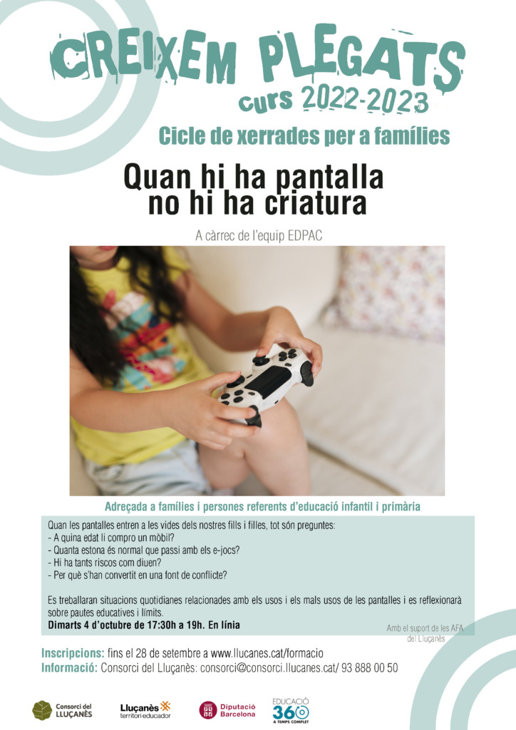 La primera xerrada serà “Quan hi ha pantalla no hi ha criatura” el proper dimarts 4 d’octubre i anirà a càrrec de l’Equip EdPAC (Educació per a l’Acció Crítica), una de les entitats catalanes referents en l’educació en el bon ús de les pantalles. Aquesta xerrada complementa l’activitat de teatre-taller “Estàs pantallat?” dirigida a l’alumnat de cicle superior que la mateixa entitat farà a algunes escoles del territori.