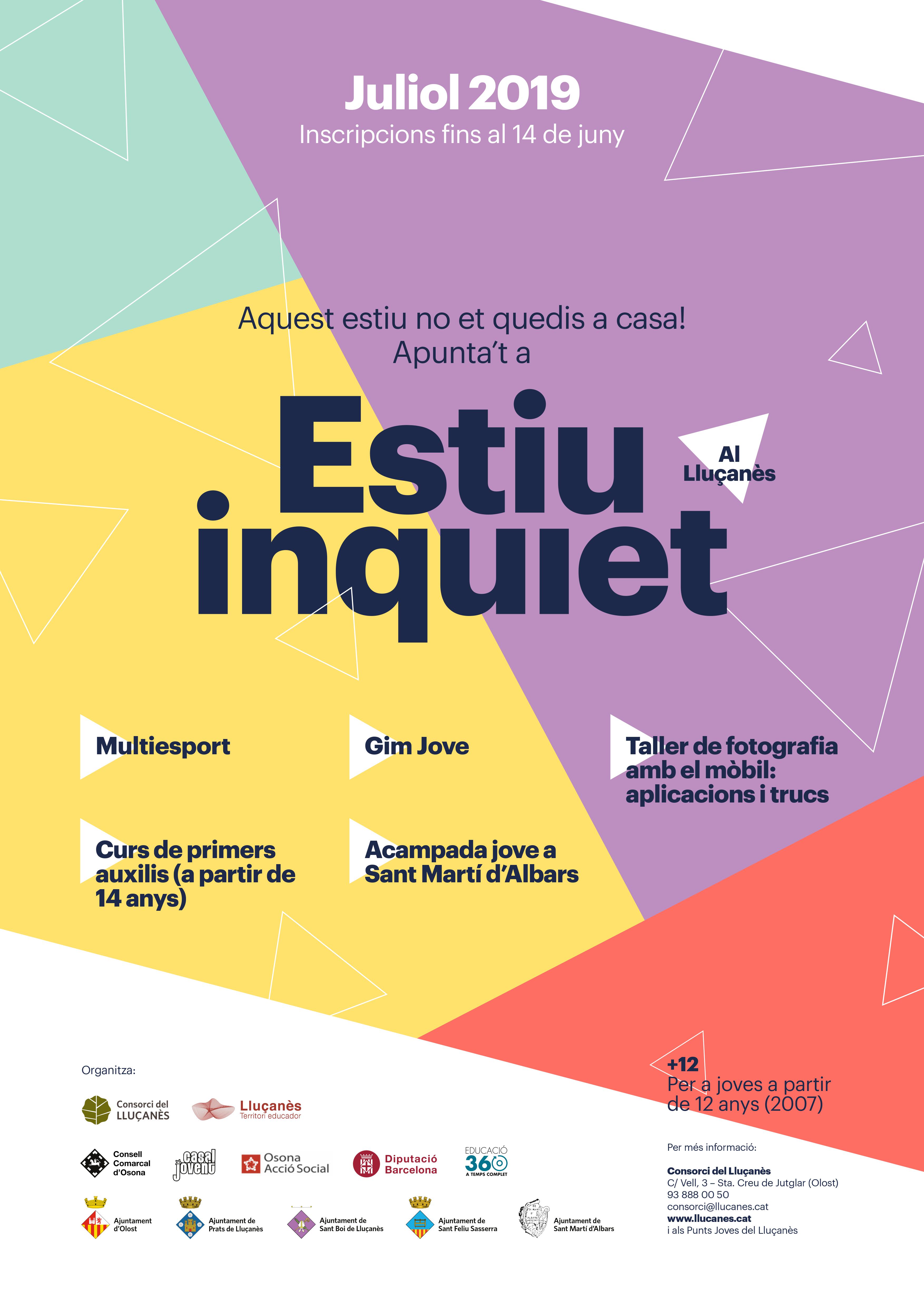 El projecte pretén donar continuïtat a la prova pilot que es va iniciar l’estiu del 2018, en la qual van participar un total de 78 joves de tot el Lluçanès. La valoració que se’n va fer va ser molt positiva tant per part de les persones participants com també per les seves famílies fent que es considerés donar-li continuïtat. La programació d’enguany incorpora alguna novetat com una acampada jove a Sant Martí d’Albars com a activitat engrescadora on participaran a la vegada tots els joves del Lluçanès que s’hagin inscrit a alguna de les activitats de l’Estiu Inquiet. Un taller de fotografia des del mòbil o el curs de primers auxilis complementen l’oferta d’enguany. Com a activitat continuista hi haurà el Gimjove, a Olost, i el Multiesport a Sant Boi de Lluçanès. A més, el projecte pretén garantir l’accés a tot el jovent i per tant el preu de les activitats són parcialment subvencionats. (Les quotes van des dels 12 fins als 58 euros). A més, i com a novetat important a destacar, les famílies que ho necessitin podran sol·licitar beca dins la línia de beques d’estiu del Consorci del Lluçanès.