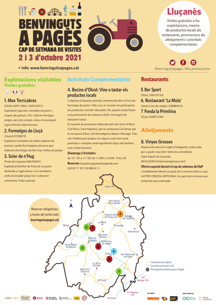 Durant el cap de setmana 2 i 3 d’octubre tres explotacions del Lluçanès (Mas Terricabras, Formatges de Lluçà i el Soler de n’Hug) oferiran visites guiades gratuïtes que permetran a la ciutadania conèixer l’origen dels productes que es consumeixen cada dia i experimentar la vida a pagès. Per poder participar de les visites caldrà fer la reserva a través del portal benvingutsapages.cat .