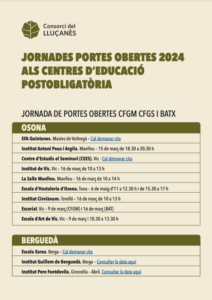Durant les properes setmanes hi haurà jornades de portes obertes a diferents centres educatius. És una gran oportunitat per conèixer els estudis i els centres amb profunditat a través de les xerrades que s’ofereixen.