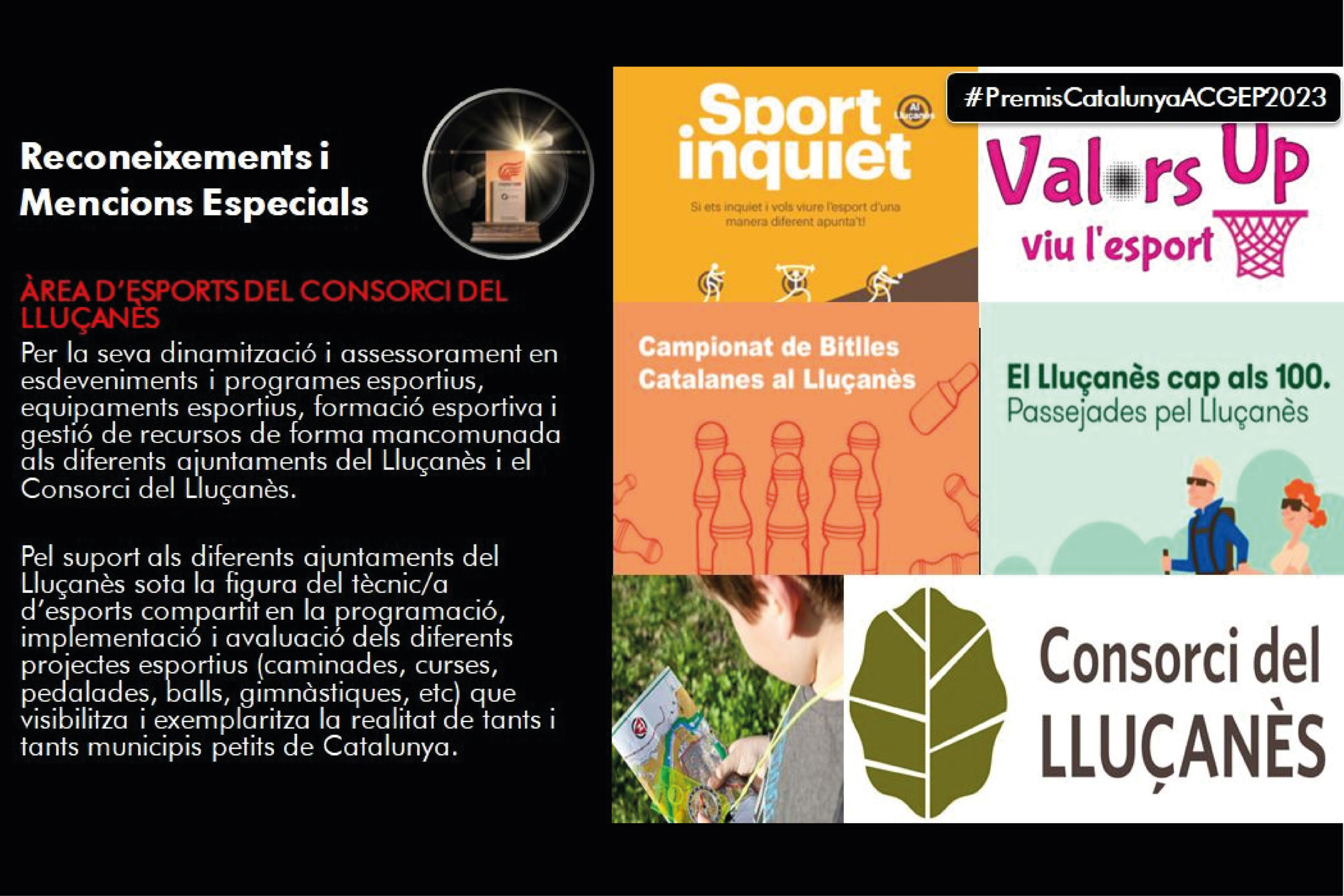 El Consorci del Lluçanès va rebre el passat 17 de març una menció especial en el marc dels VIII Premis Catalunya a la Gestió Esportiva, impulsats per l’Associació Catalana de Gestors Esportius Professionals (ACGEP).