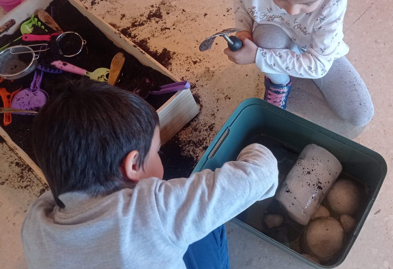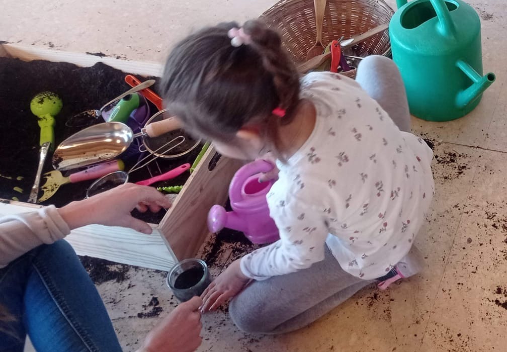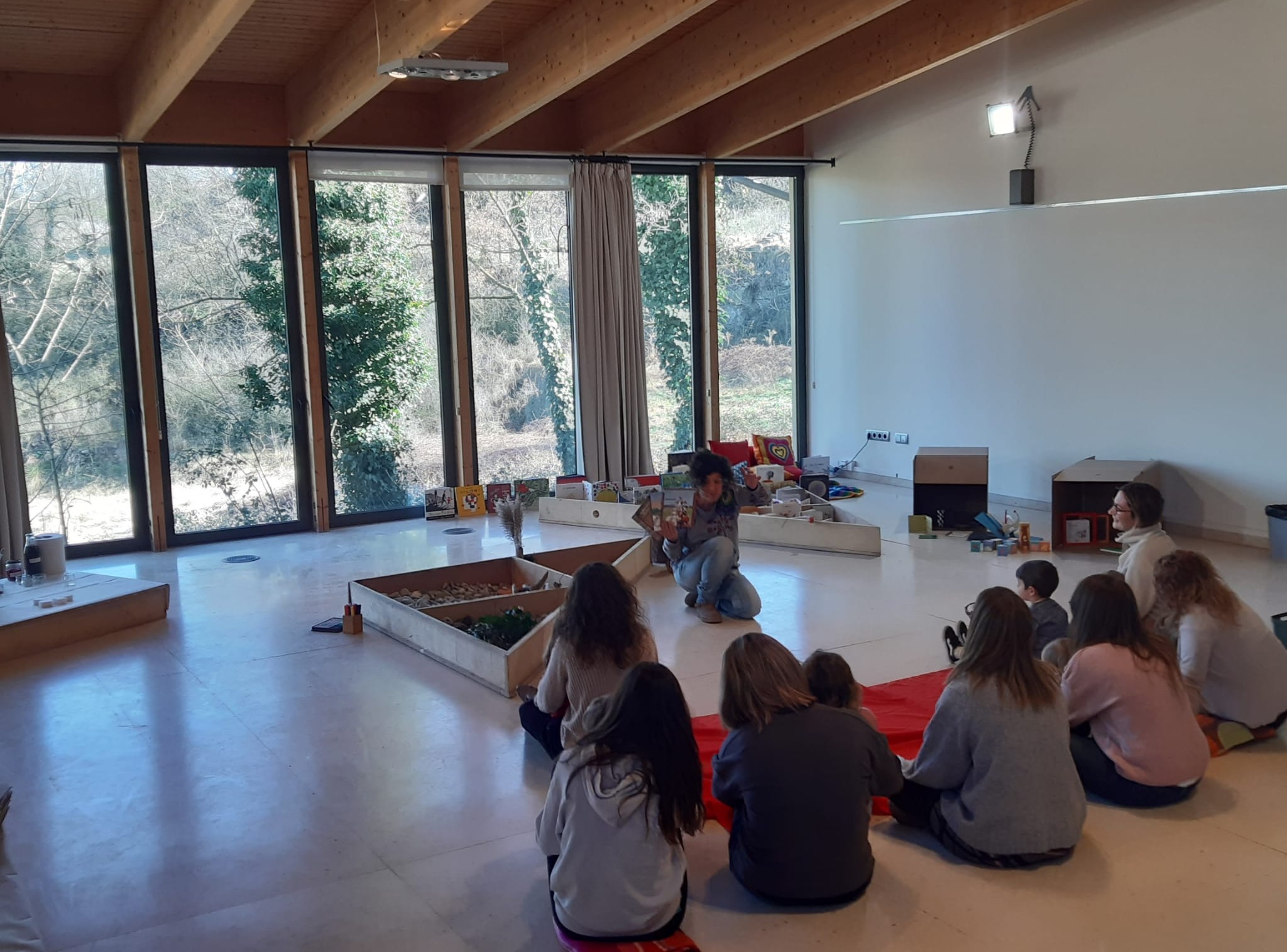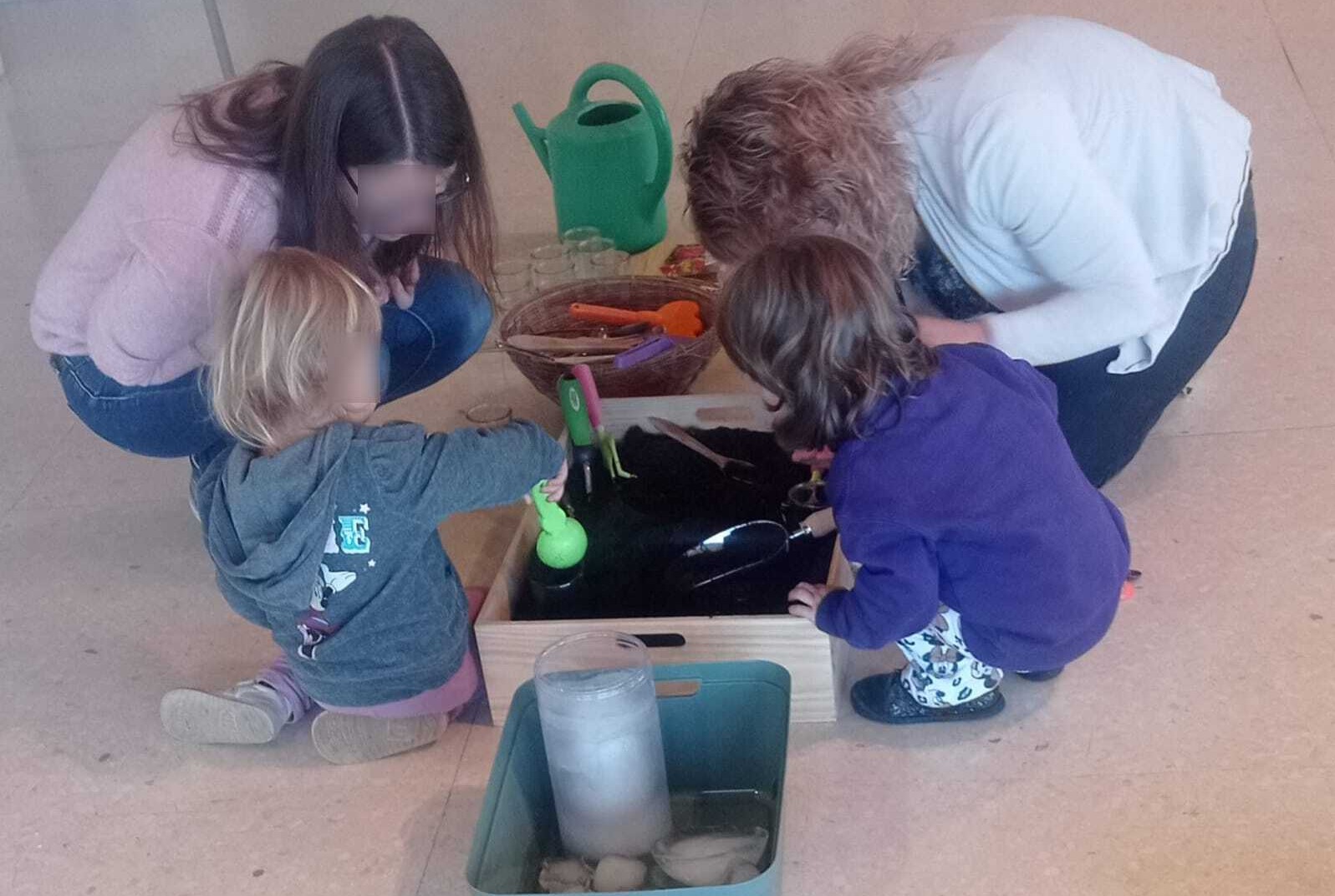 L’espai es va organitzar en diversos ambients d’experimentació: l’aigua i els colors naturals; el sòl del Lluçanès —amb sorra i fang—; els elements naturals; i un racó de contes. Mitjançant la manipulació, l’observació i el joc compartit, es va potenciar la curiositat, la creativitat i la descoberta en família, tot respectant els ritmes individuals dels infants.