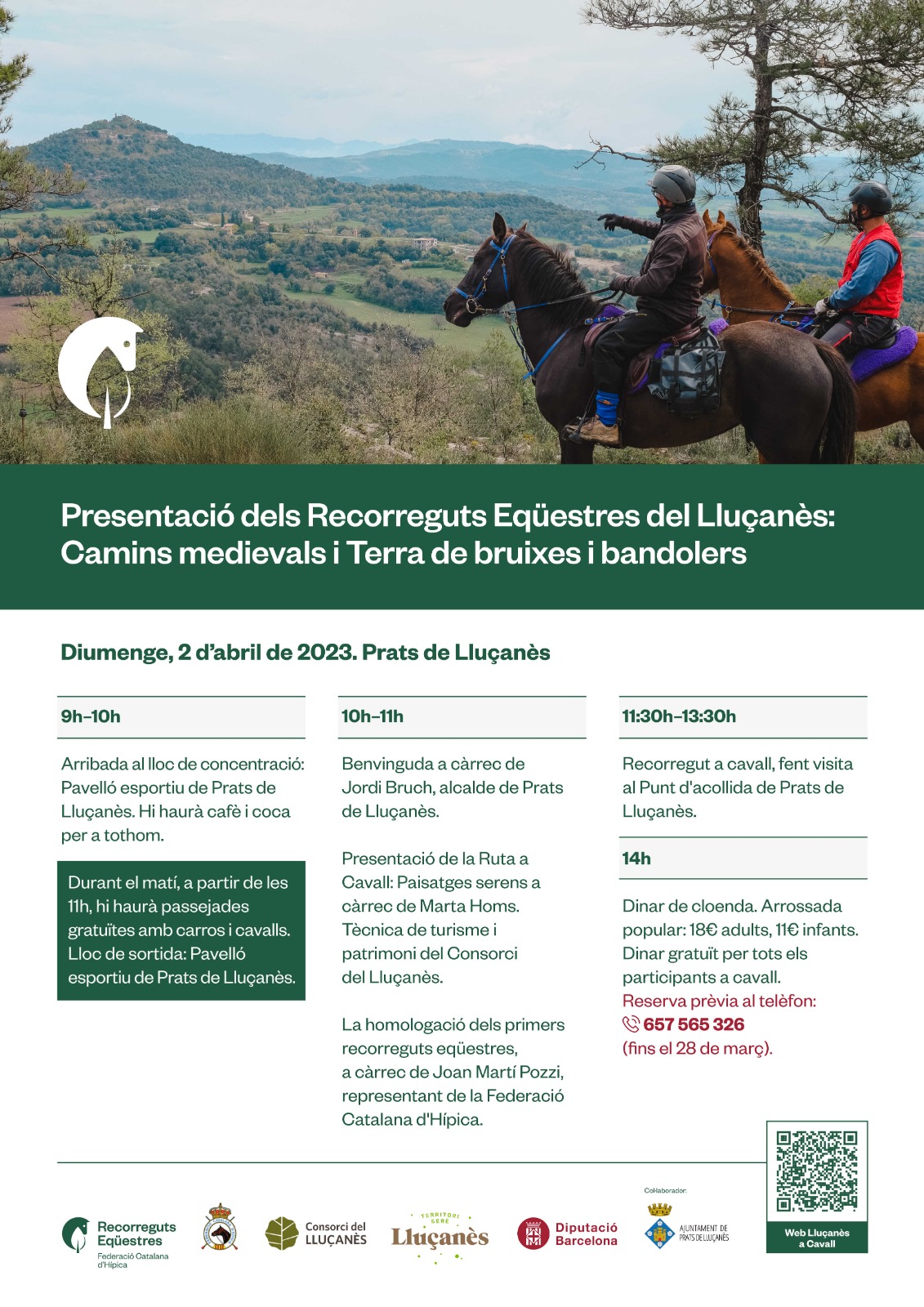El diumenge 2 d’abril es farà la presentació dels recorreguts eqüestres al sector al pavelló esportiu de Prats de Lluçanès. Es podrà fer un tastet dels recorreguts a cavall i hi haurà passejades amb carros i cavalls gratuïtes per a tothom. Les persones que s’inscriguin a la jornada i vinguin amb cavall seran convidat gratuïtament al dinar. La reserva es pot fer fins el dia 28 de març trucant al 657 565 326.