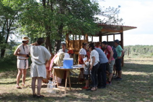 La visita teatralitzada va culminar amb un tastet de productes a base de receptes romanes: pa d’espelta integral i ecològica amb formatge i garum (salsa feta a base d’anxova), farinetes de guixera (pulmentum), amb cansalada, botifarra, alls, oli d’oliva, farina d’almortes, barreja d’espècies ras el hanout, ou dur, amb salsa amb menta, i vi calent amb espècies.
