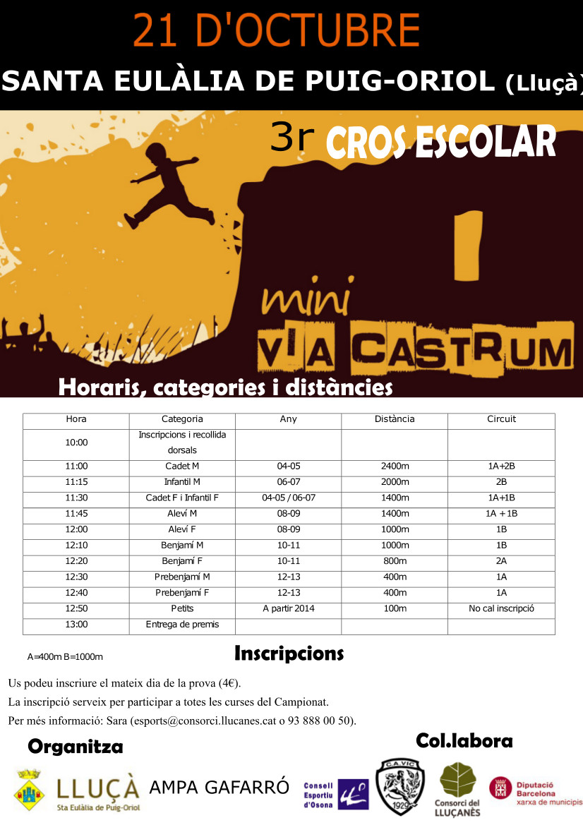 La següent parada és el 3r cros escolar Mini Via Castrum de Santa Eulàlia de Puig-oriol (Lluçà) que es realitzarà el proper 21 d’octubre a partir de les 11h a davant del local social amb les curses de cadets, infantils, alevis, benjamins, prebanjamis i per finalitzar es realitzarà la cursa dels més petits. El preu de la inscripció és de 4€ i el dorsal serveix per córrer totes les curses del campionat.