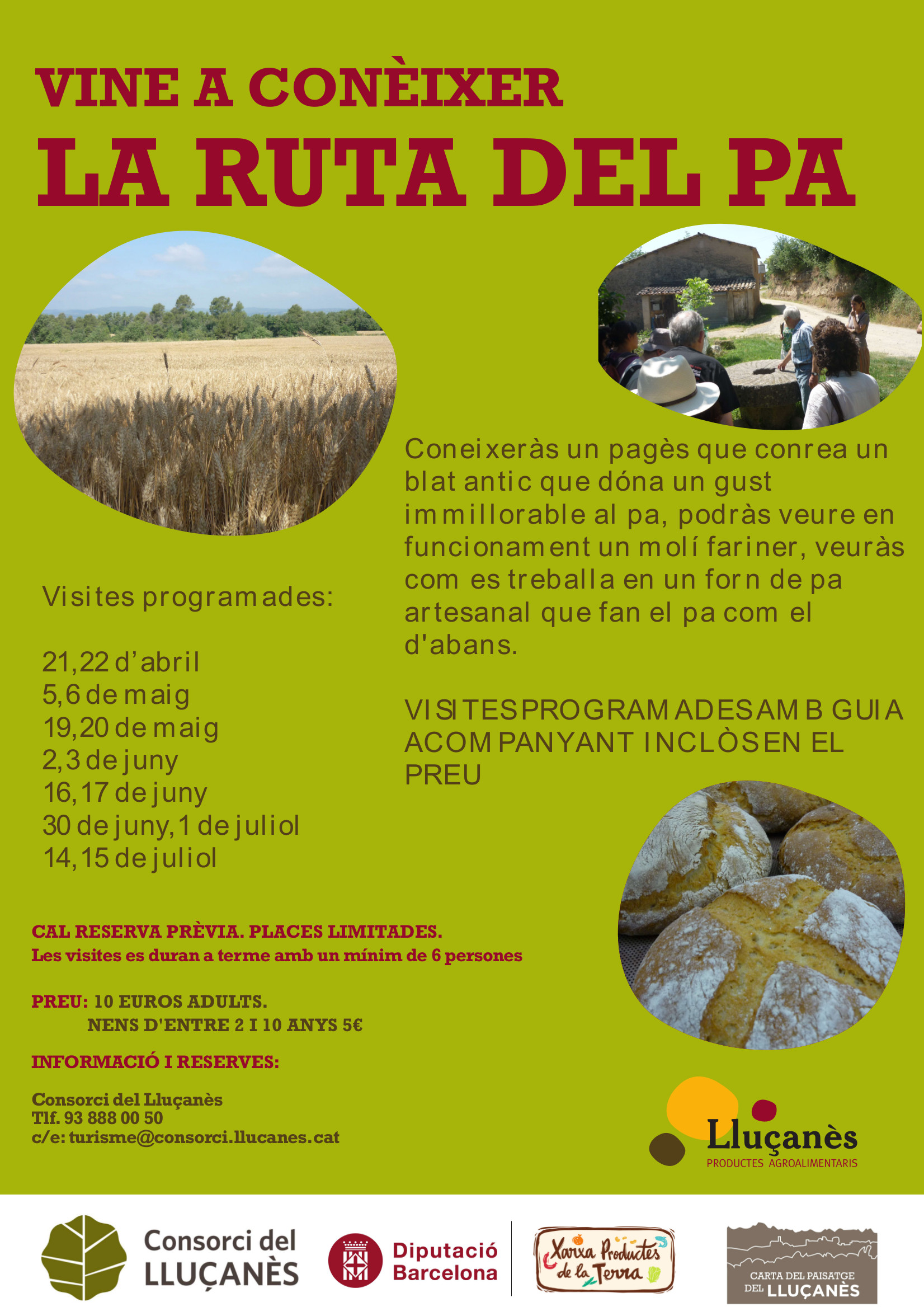 Durant els mesos d’abril, maig, juny i juliol del 2018 es realitzaran les visites guiades de la Ruta del Pa al Lluçanès. Es tracta de visites agroalimentàries programades amb guia acompanyant inclòs, per tal de conèixer un pagès a Oristà que conrea un blat antic (el blat forment), el funcionament d’un antic molí fariner (el molí de Puig-oriol) i l’elaboració del pa artesanal, cuit amb pa de llenya, com el d’abans a Sant Boi de Lluçanès!
