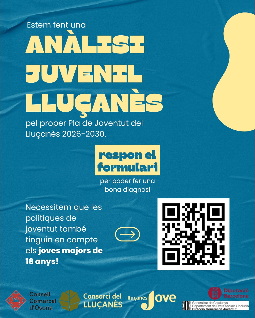 El Consell Comarcal d’Osona, el Consorci del Lluçanès, l’Oficina Jove del Lluçanès, amb el suport de la Direcció General de Joventut i la Diputació de Barcelona, estan desenvolupant el nou Pla de Joventut del Lluçanès 2026-2030.