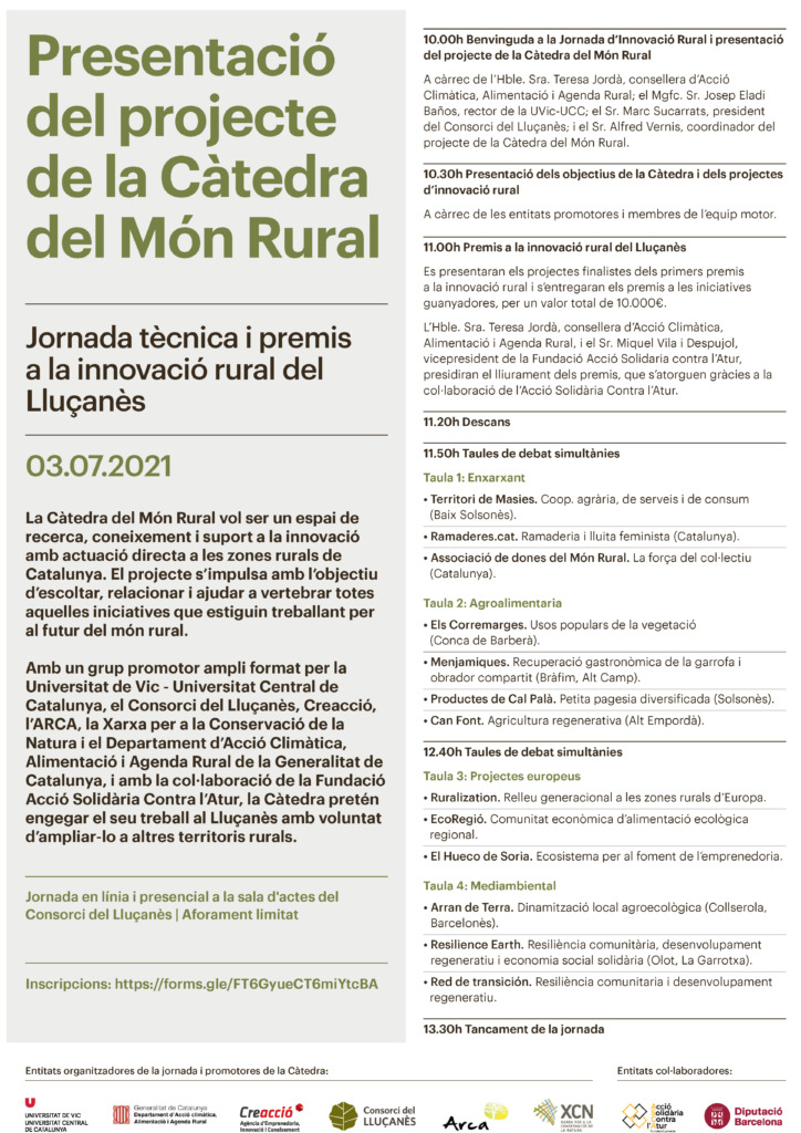 L’acte començarà a les 10 del matí, amb la benvinguda a càrrec de l’Hble. Teresa Jordà, consellera d’Acció Climàtica, Alimentació i Agenda Rural, el rector de la Uvic-UCC, Josep Eladi Baños, el president del Consorci del Lluçanès, Marc Sucarrats i el coordinador del projecte de la Càtedra del Món Rural, Alfred Vernis.
