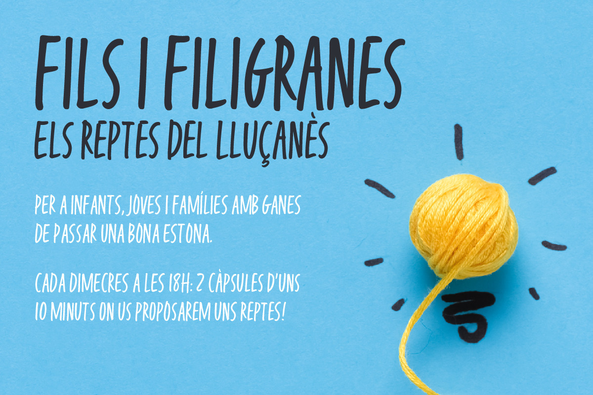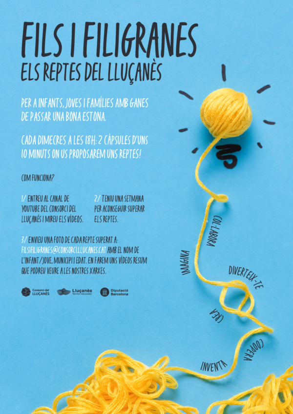 Des del Consorci del Lluçanès iniciem el projecte FILS I FILIGRANES, un conjunt de vídeos a partir dels quals els infants, joves i famílies del Lluçanès, malgrat la situació actual, puguin aprendre i vivenciar experiències diferents, creatives, imaginatives, de superació, de col·laboració, etc.