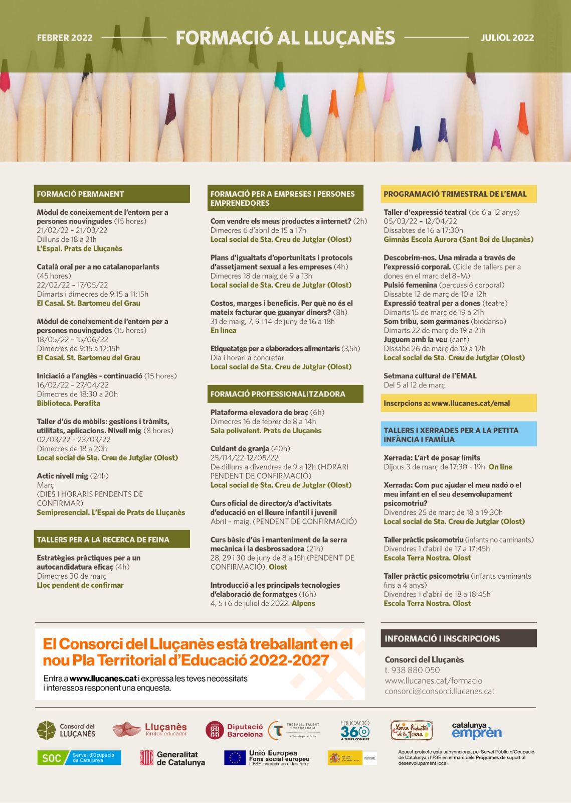 - Aquí trobaràs tots els cursos organitzats pel Consorci del Lluçanès pel període febrer – juliol 2022. Pots consultar la programació completa aquí.