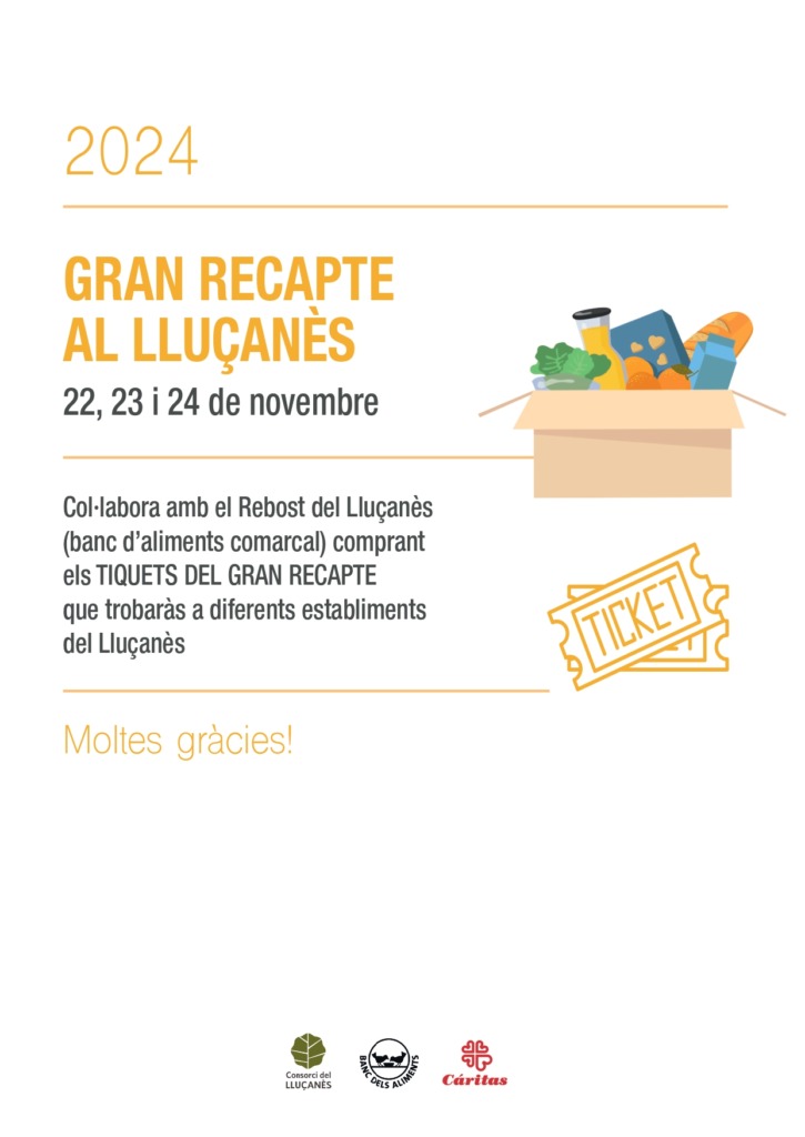 Els dies 22, 23 i 24 de novembre arriba el gran Recapte al Lluçanès per tal de col·laborar amb el Rebost del Lluçanès (banc d’aliments comarcal), que dona assistència a una cinquantena de famílies.