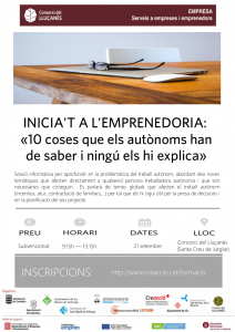 En el marc del Programa de Formació Osona 2017 dirigida a empreses i emprenedors i amb -col·laboració amb Creacció, el Consorci del Lluçanès organitza la sessió informativa “Inicia’t a l’emprenedoria: 10 coses que els autònoms han de saber i ningú els hi explica”. Tindrà lloc a Sta. Creu de Jutglar el proper 21 de setembre de 9:15-13:15h.