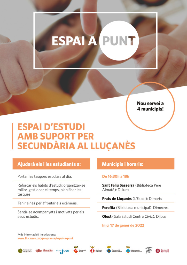 El Consorci del Lluçanès, el Servei de Joventut del Lluçanès i els ajuntaments de Olost, Perafita, Prats de Lluçanès i Sant Feliu Sasserra engeguen la segona edició del projecte adreçat als i a les estudiants d’educació secundària del Lluçanès: ‘l’Espai A Punt’. El projecte compte amb el suport econòmic de la Diputació de Barcelona i es construeix amb la col·laboració de l’Insittut Castell del Quer, de Prats de Lluçanès.