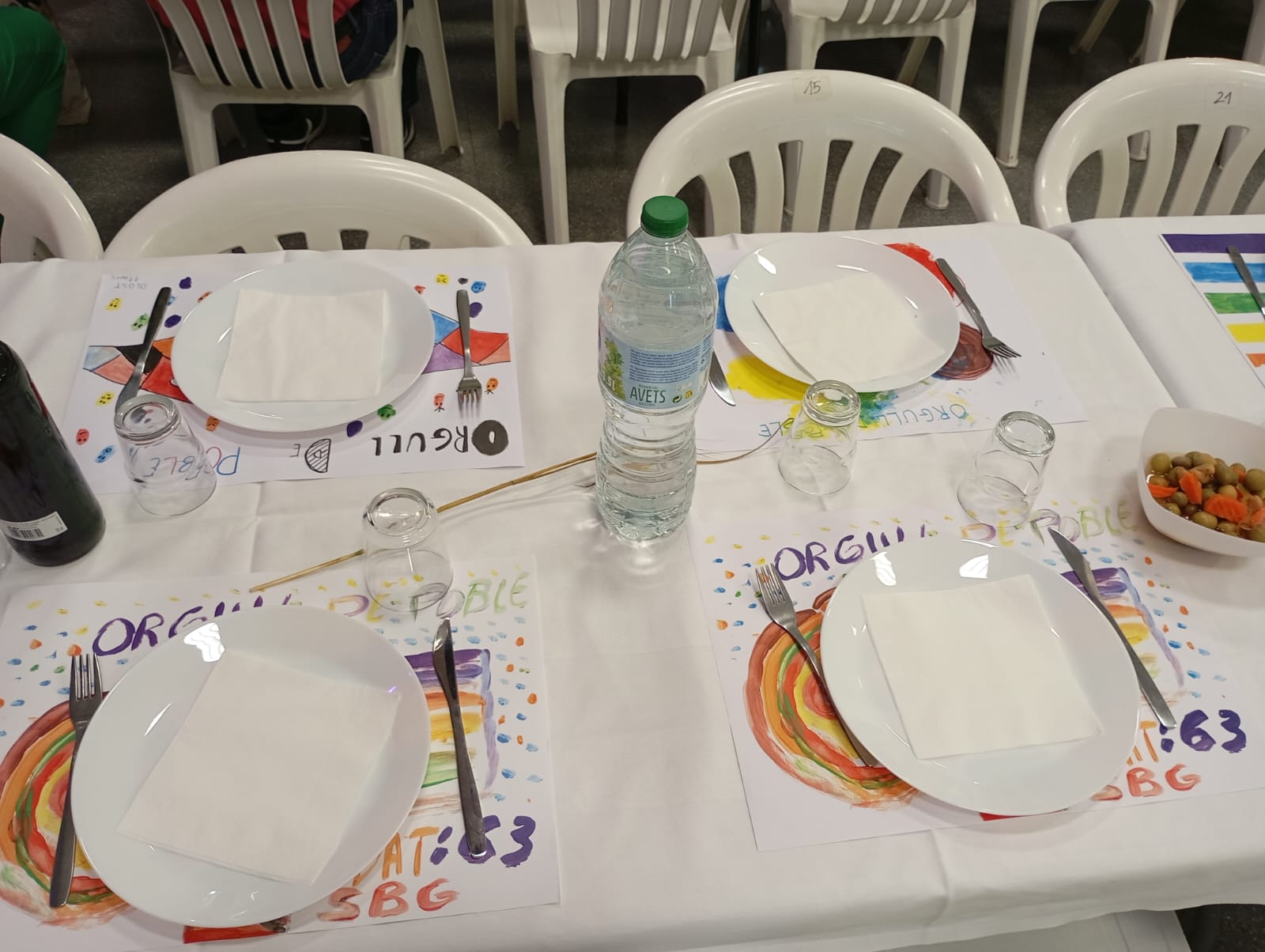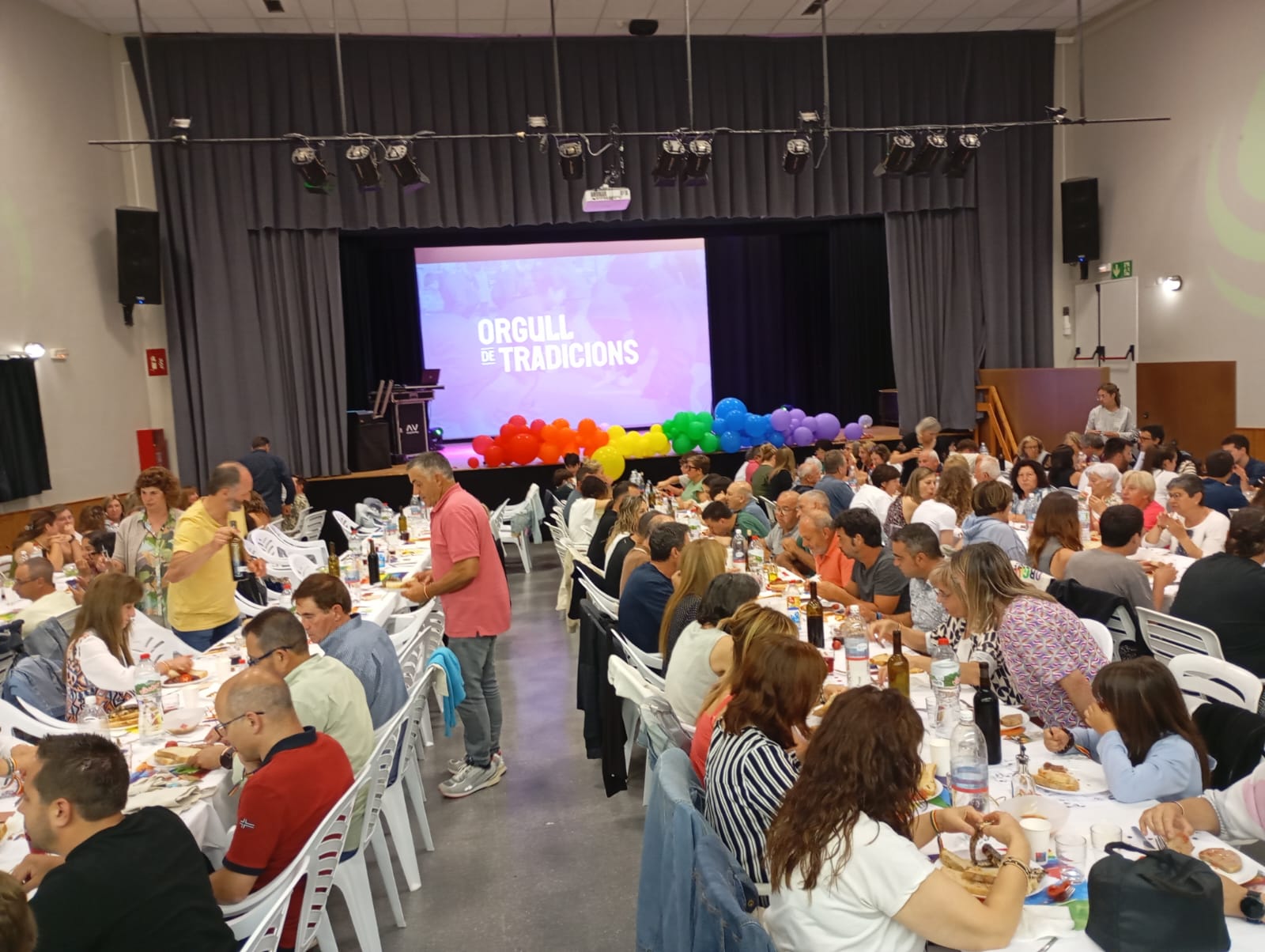 A l’arribada al Teatre Municipal, actors i actrius del Grup local de teatre feien la recepció amb uns còctels de préssec i s’entregava una bossa tipus tote bag i una polsera amb el lema de la campanya “Orgull de poble”, finançats pel Consorci del Lluçanès. Tot seguit, després d’unes paraules de benvinguda i reconeixement de la importància d’un acte com aquest per part del regidor d’Igualtat del municipi, Rubèn Morcillo, es va donar pas al sopar “de carn o peix” amb unes taules vestides amb les estovalles que persones de tot el Lluçanès van confeccionar en els tallers del 17 de maig (Dia contra la LGTBIfòbia).