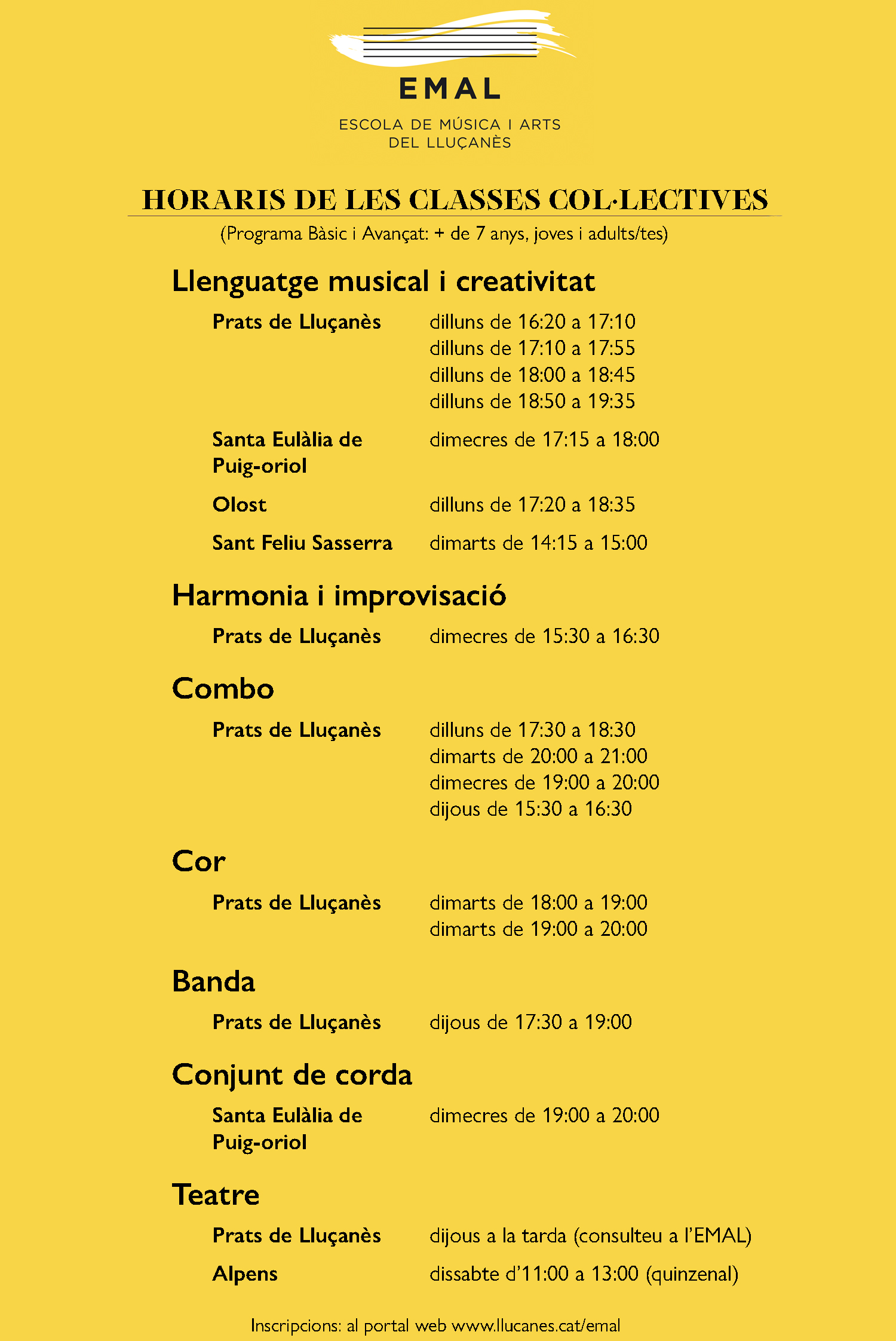 Els cursos de llarga durada, dividits en tres etapes educatives, INICIAL (de 3 a 6 anys), BÀSICA I AVANÇADA (a partir de 7 anys, joves i persones adultes), es podran cursar en 6 aules del Lluçanès: a Prats de Lluçanès, Alpens, Santa Eulàlia de Puig-oriol (Lluçà), Olost, Oristà i Sant Feliu Sasserra.