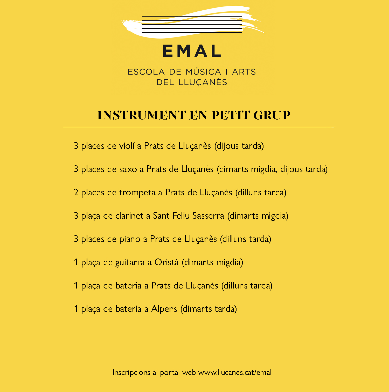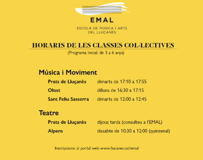 En l’inici del curs l’EMAL compta amb 134 alumnes de llarga durada, continuarà amb el projecte de banda escolar a l’Escola Heurom de Perafita, i amb els tallers trimestrals, que incorporen diferents disciplines artístiques. L’oferta del primer trimestre es podrà consultar a partir del 10 de setembre a la web: https://www.llucanes.cat/emal/tallers-trimestrals/