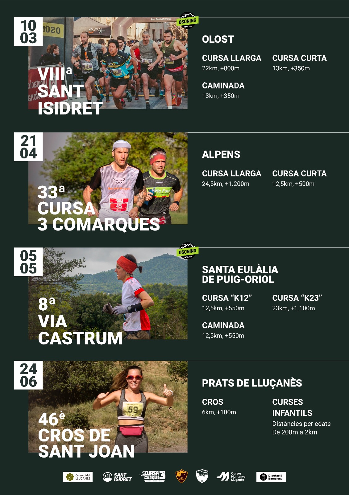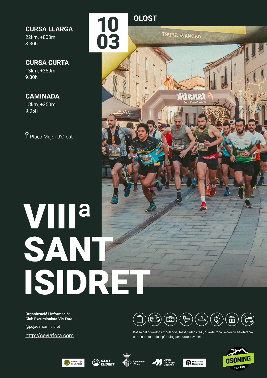 La primera cursa de muntanya s’iniciarà el 10 de març a Olost. Es tracta de la VIII edició de Sant Isidret. Consta de dues curses (una curta de 13km i una llarga de 22km) amb diferents categories masculí i femení i categoria local a cada cursa, i categoria per equips entre les dues curses; així com també una caminada de 13km. La cursa ofereix diferents serveis als participants: Bossa corredor, sorteigs de material, servei de fisioteràpia, ambulància; fotos i/o vídeos, WC,guarda-roba i pàrquing per autocaravanes. Aquesta cursa és puntuable per la Copa Osoning