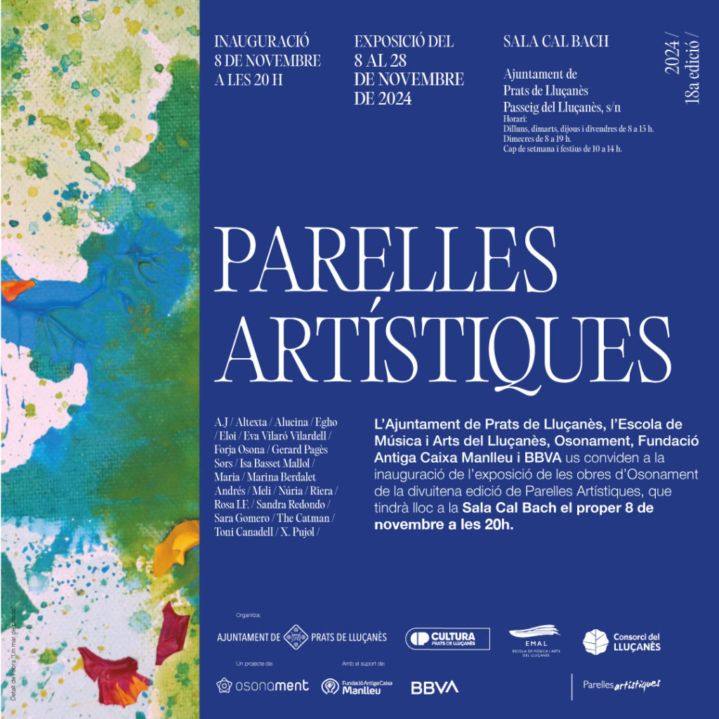 Les obres de la 18a edició d’Osona del projecte Parelles Artístiques s’exposaran properament a la Sala Cal Bach de l’Ajuntament de Prats de Lluçanès. L’acte d’inauguració tindrà lloc divendres 8 de novembre a les 20h i comptarà amb el relat de l’experiència d’alguns dels artistes que hi han participat.