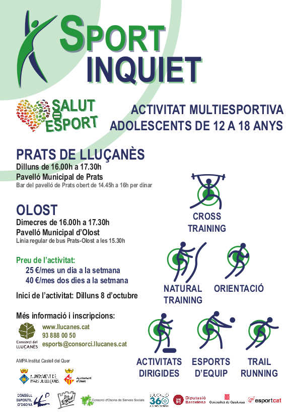 Sport Inquiet es portarà a terme als pavellons esportius de Prats de Lluçanès (els dilluns) i d’Olost (els dimecres), sempre de 16 a 17:30h. Els joves tindran l’opció d’inscriure’s un únic dia o bé tots dos dies amb unes quotes de 25 euros mensuals (un dia) i 40 euros mensuals (2 dies).