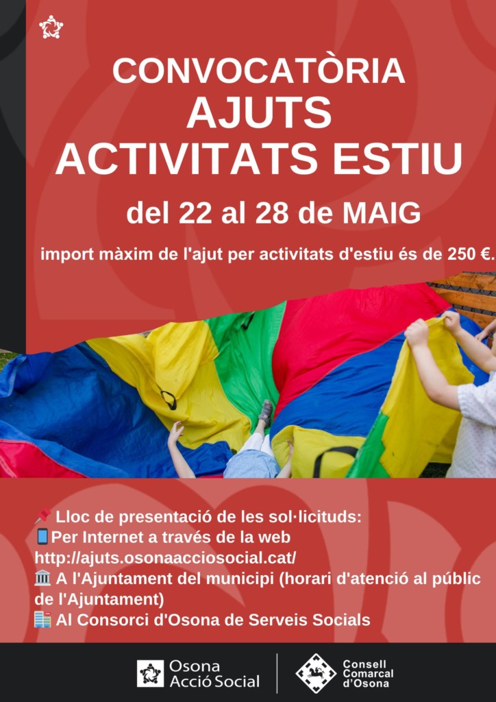 El Consorci d’Osona de Serveis Socials, amb els ajuntaments del Lluçanès adherits, obre una convocatòria d’ajuts d’estiu per rebre fins a un màxim de 250 euros per cobrir part de la despesa d’activitats educatives de lleure d’estiu tals com acampades, activitats esportives, campus, casals, colònies, cursos, estades, i altres activitats destinades al lleure dels infants entre 3 i 16 anys que es duguin a terme durant el període d’estiu, que no hi ha escola, per a les famílies que es trobin en situació de necessitat econòmica i social.