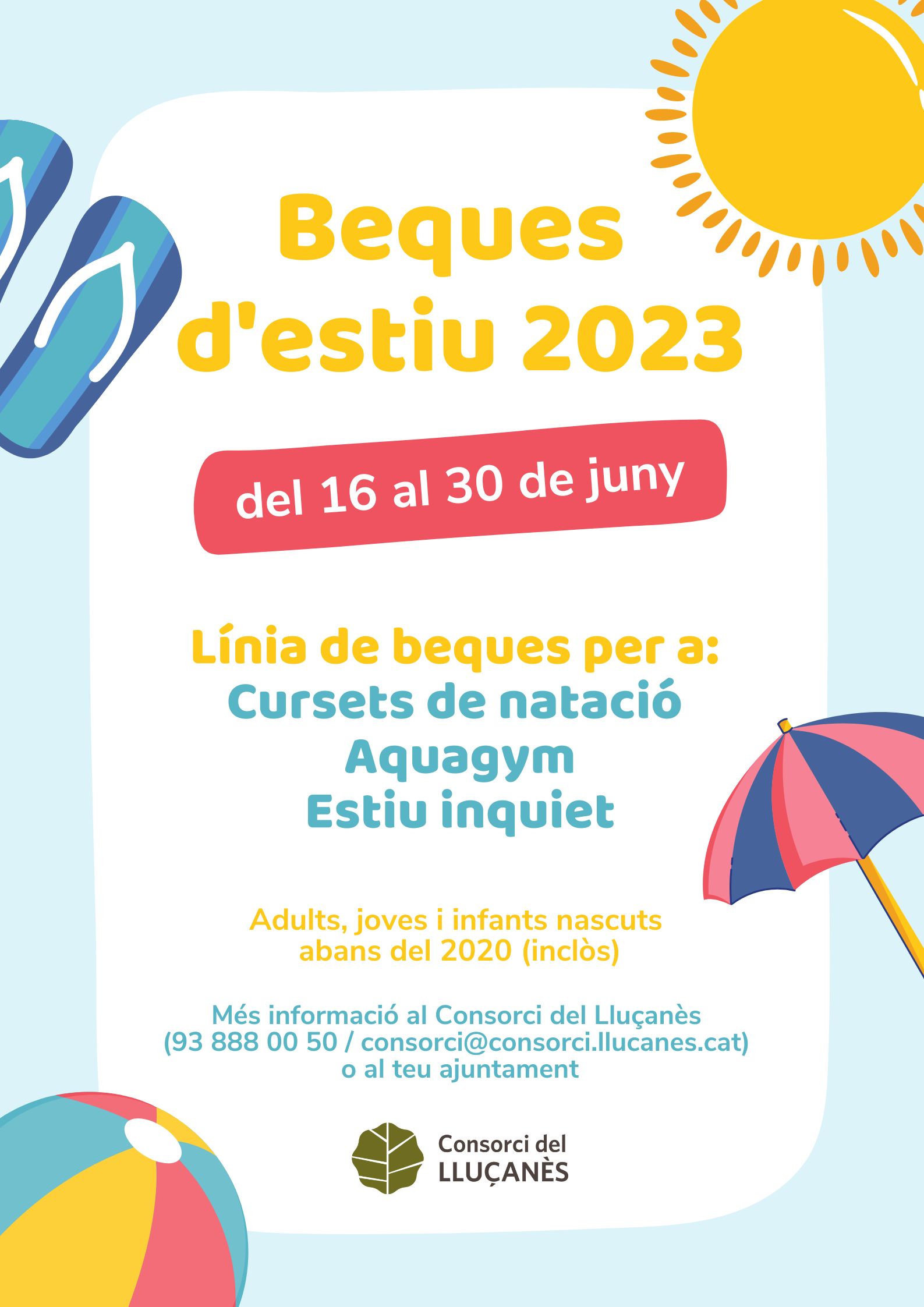El Consorci del Lluçanès obre una nova convocatòria per oferir beques esportives a infants, adolescents i adults nascuts abans del 2020 (inclòs) empadronats als municipis d’Alpens, Lluçà, Olost, Oristà, Perafita, Prats de Lluçanès, Sant Agustí de Lluçanès, Sant Boi de Lluçanès, Sant Feliu Sasserra, Sant Martí d’Albars i Sobremunt, que realitzin cursets de natació, aquagym i/o participin a les activitats de l’Estiu Inquiet 2023.