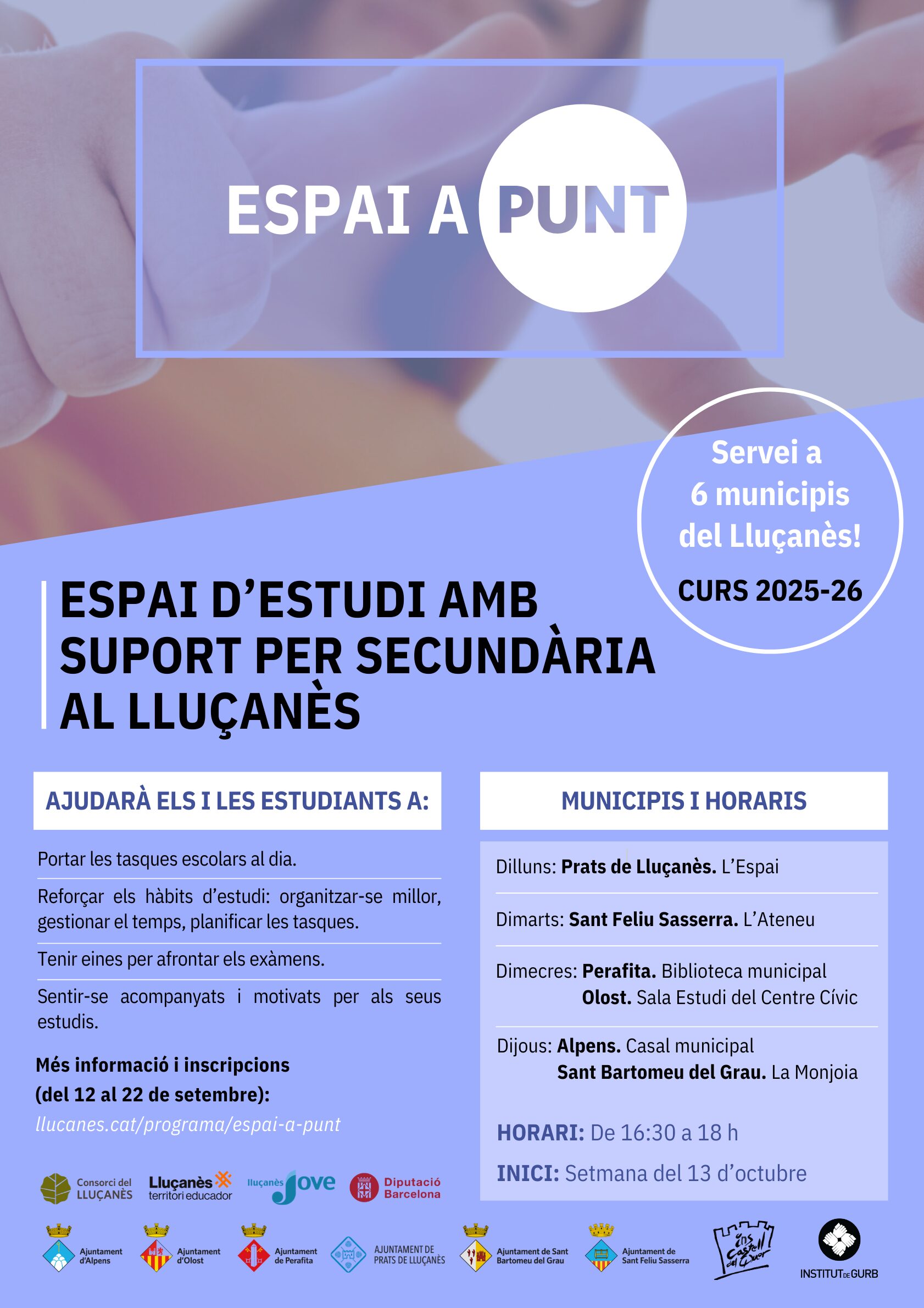 El servei “Espai A Punt”, destinat a l’acompanyament escolar de l’alumnat d’ESO, torna aquest curs 2025-2026 a sis municipis del Lluçanès. El projecte arriba enguany a la sisena edició, totalment consolidat i molt ben valorat per famílies, joves i centres educatius.