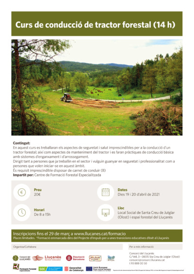 • El segon curs serà el de Conducció del tractor forestal. Es realitzarà els dies 19 i 20 d’abril i tindrà una durada de 14 hores. En aquest curs es treballaran els aspectes de seguretat i salut imprescindibles per a la conducció d’un tractor forestal; així com aspectes de manteniment del tractor i es faran pràctiques de conducció bàsica amb sistemes d’enganxament i d’arrossegament. És necessari disposar del carnet de conduir.