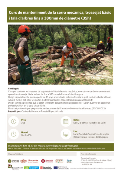 • El primer curs serà el de manteniment de la serra mecànica, trossejat bàsic i tala d’arbres fins a 380mm de diàmetre. Està especialment dirigit a aquells joves a partir de 16 anys (amb o sense ESO) que actualment no estan estudiant ni treballant a temps complert. Es realitzarà del 12 al 16 d’abril i tindrà una durada de 35 hores. El curs té per objectiu que l’alumnat adquireixi un coneixement exhaustiu de tot allò que li cal per fer un correcte ús de la serra mecànica i de les principals tècniques de tala d’arbres per a treballar a bosc. Una vegada finalitzat, els joves que s’hagin pogut sentir motivats per aquest àmbit formatiu podrien inscriure’s a un dels diversos cicles formatius de grau mitjà de la família professional agrària. (inscripcions pel curs 21-22  de l’11 al 17 de maig). A més, aquest curs és una preparació bàsica per al certificat de motoserrista europeu (ECC- European Chainsaw Certificate) que s’ha començat a implantar a Catalunya des del 2014 i té per objectius augmentar la mobilitat dins del mercat comú europeu i reforçar el sector forestal i la gestió de les zones verdes respecte a l’ús de la motoserra.