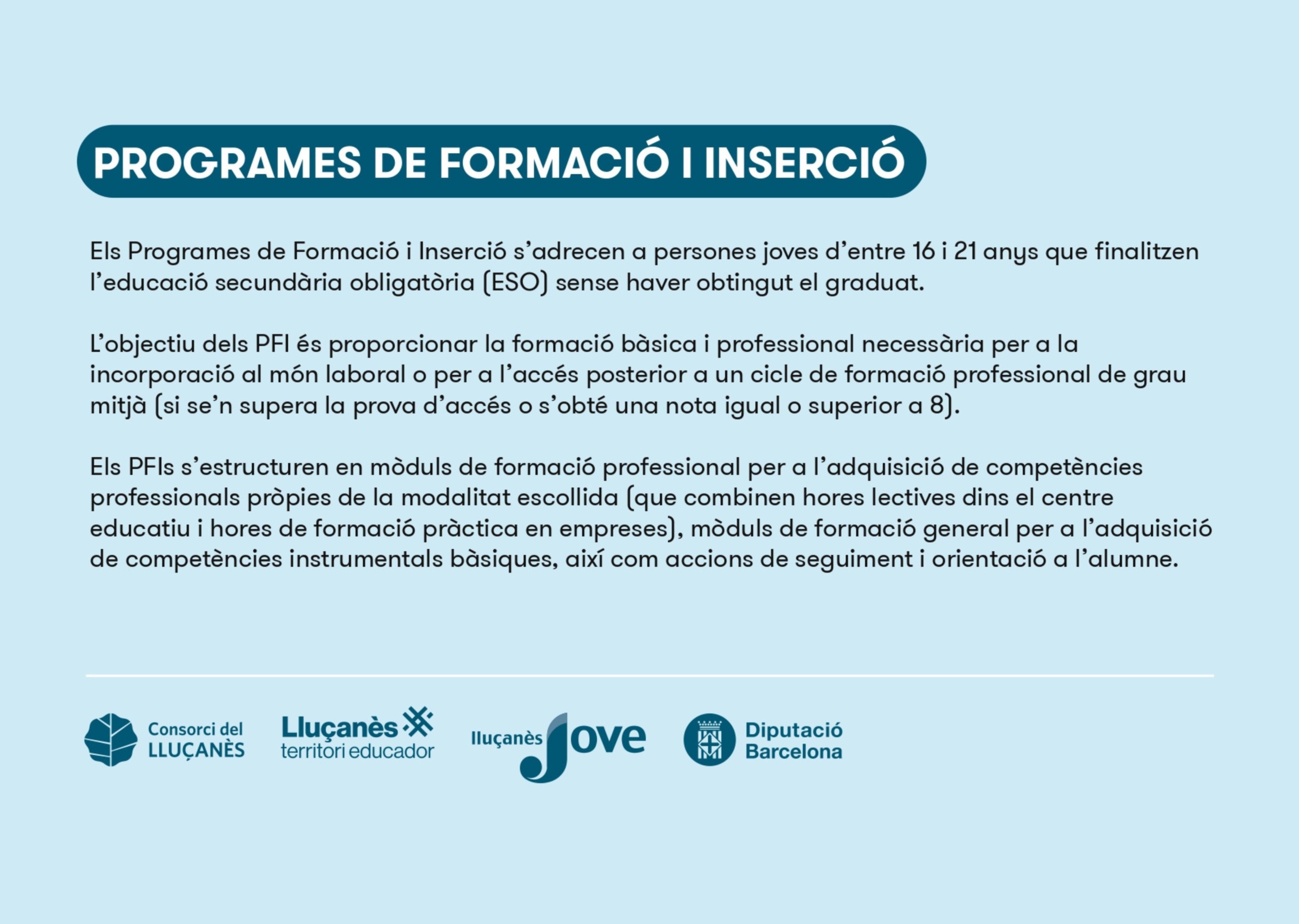 Els joves que no obtinguin el graduat en ESO poden accedir als Programes de Formació i Inserció (PFI), adreçats a nois i noies d’entre 16 i 21 anys.