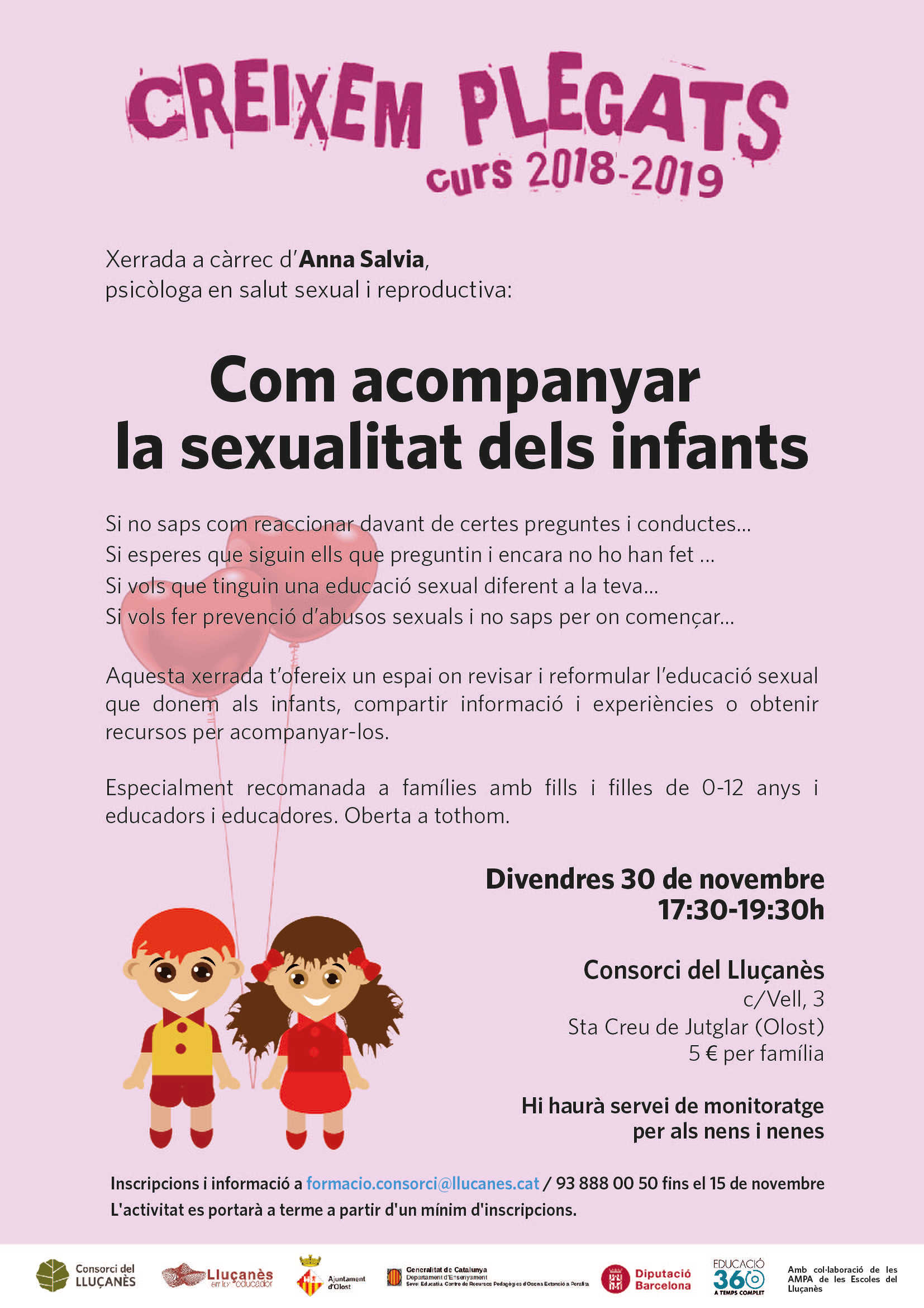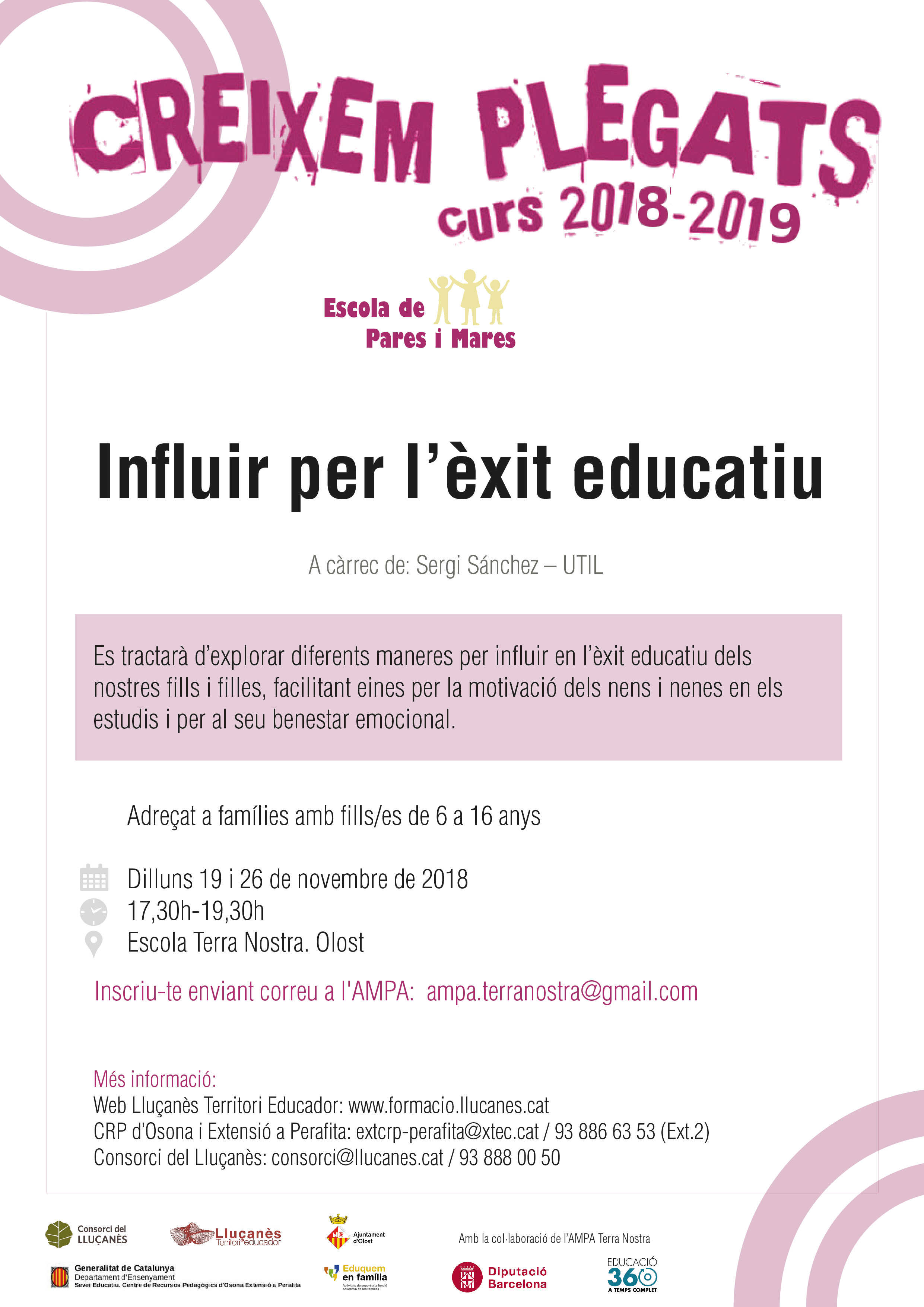 Una nova edició de l’Escola de pares i mares amb un total de 7 propostes per el curs 2018-19 i que inclou xerrades, tallers, teatre-fòrum … tira endavant dins el marc del Pla Territorial Educatiu Lluçanès Territori Educador  del Consorci del Lluçanès amb el suport de les AMPAs, els ajuntaments, el Centre de Recursos Pedagògics d’Osona (extensió de Perafita) Serveis Socials i Diputació de Barcelona.