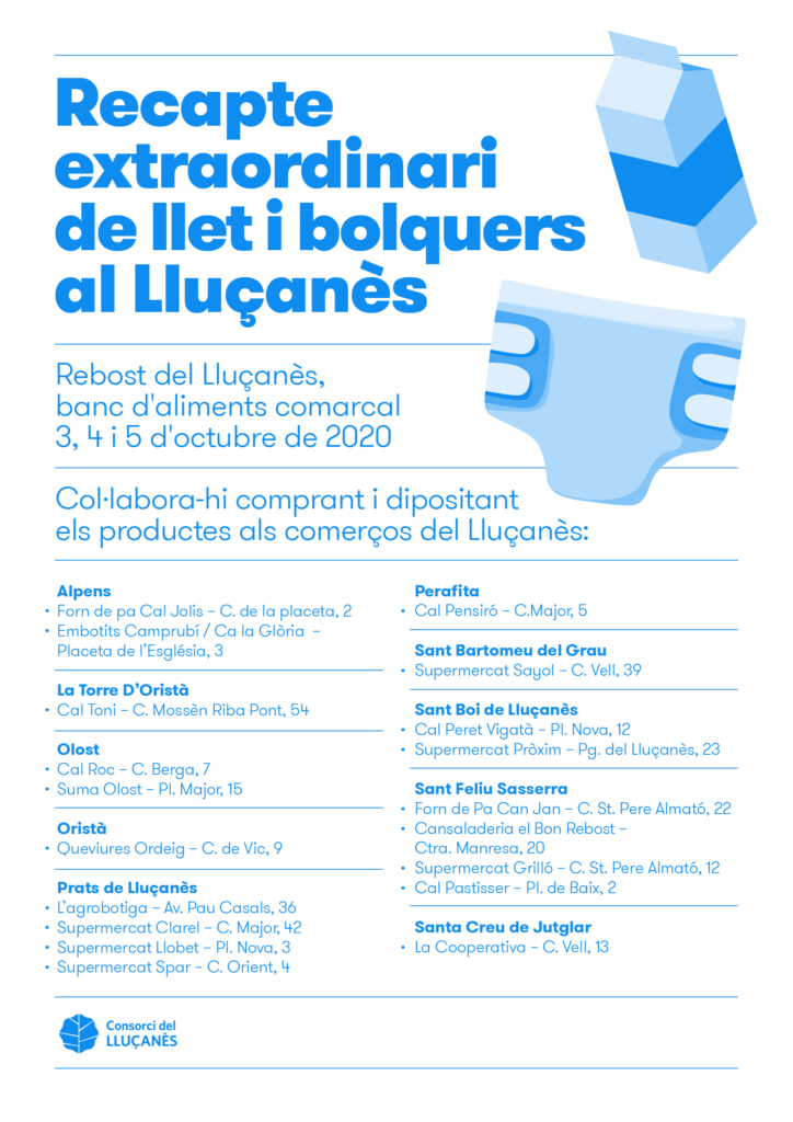 Els dies 3, 4 i 5 d’octubre tindrà lloc el recapte de llet i bolquers pel Rebost del Lluçanès, el banc d’aliments que proveeix tots els municipis del Lluçanès. Les persones que vulguin fer donacions, les podran fer als mateixos establiments comercials de cada municipi.