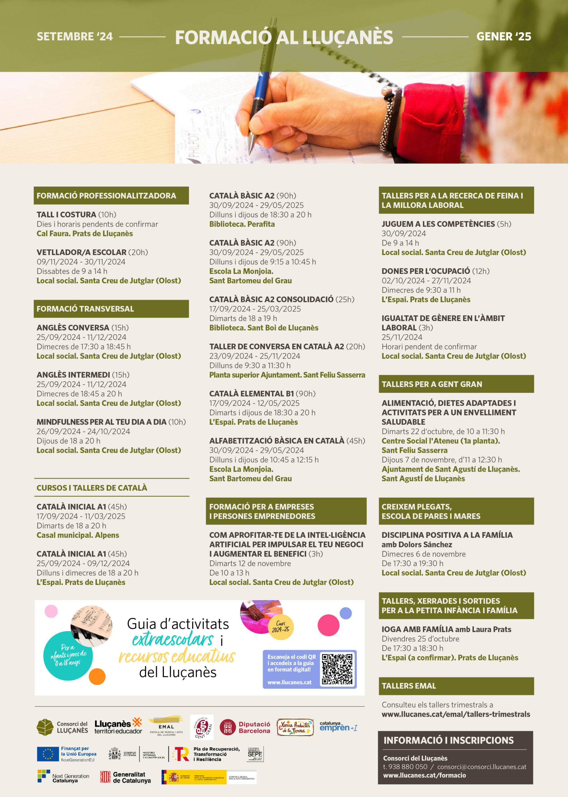 Al programa també hi podreu consultar les dates i horaris d’altres formacions i activitats puntuals. Tallers per a la gent gran: “Alimentació, dietes adaptades i activitats per a un envelliment saludable”, que tindrà lloc a St. Feliu Sasserra i St. Agustí de Lluçanès; Tallers per a la petita infància i família: “Ioga en família”, que tindrà lloc a l’octubre a Prats de Lluçanès; xerrades per a famílies del programa Creixem plegats: “Disciplina positiva a la família”, el novembre a Sta. Creu de Jutglar i, finalment, diversos tallers artístics que promou l’Escola de Música i Arts del Lluçanès.