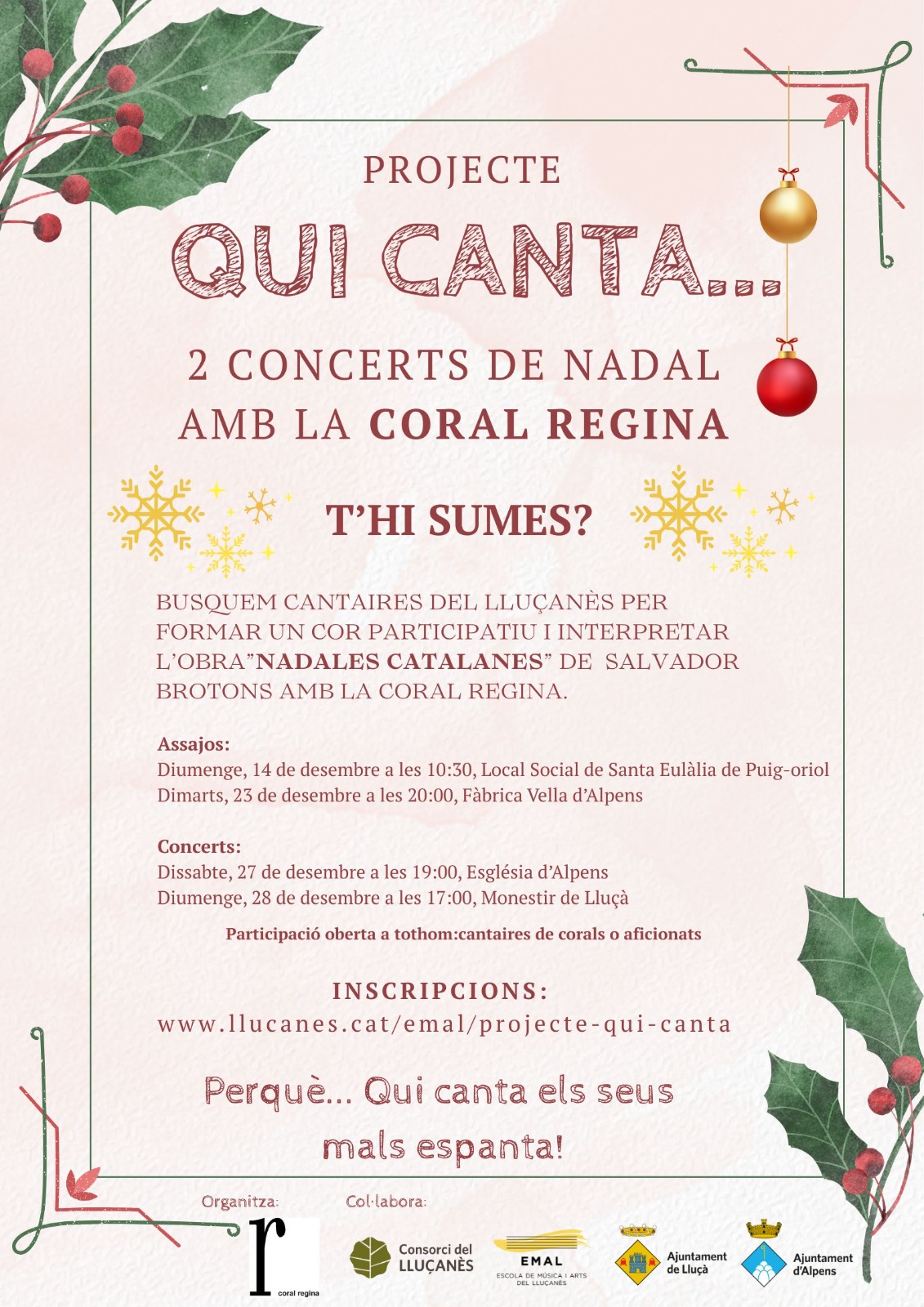 La Coral Regina, amb el suport dels ajuntaments d’Alpens i Lluçà, el Consorci del Lluçanès i l’Escola de Música i Arts del Lluçanès (EMAL), impulsa aquest Nadal el Projecte “Qui canta…”, una iniciativa oberta a tothom que vulgui viure la màgia del cant coral en primera persona.