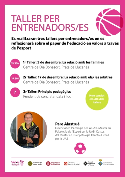 Durant el mes de desembre es realitzaran tres tallers per entrenadors i entrenadores, i monitors/es dels clubs i entitats esportives del Lluçanès per treballar la relació amb els professions de l’arbitratge, la relació amb les famílies i també donar eines i principis pedagògics dels valors de l’esport.