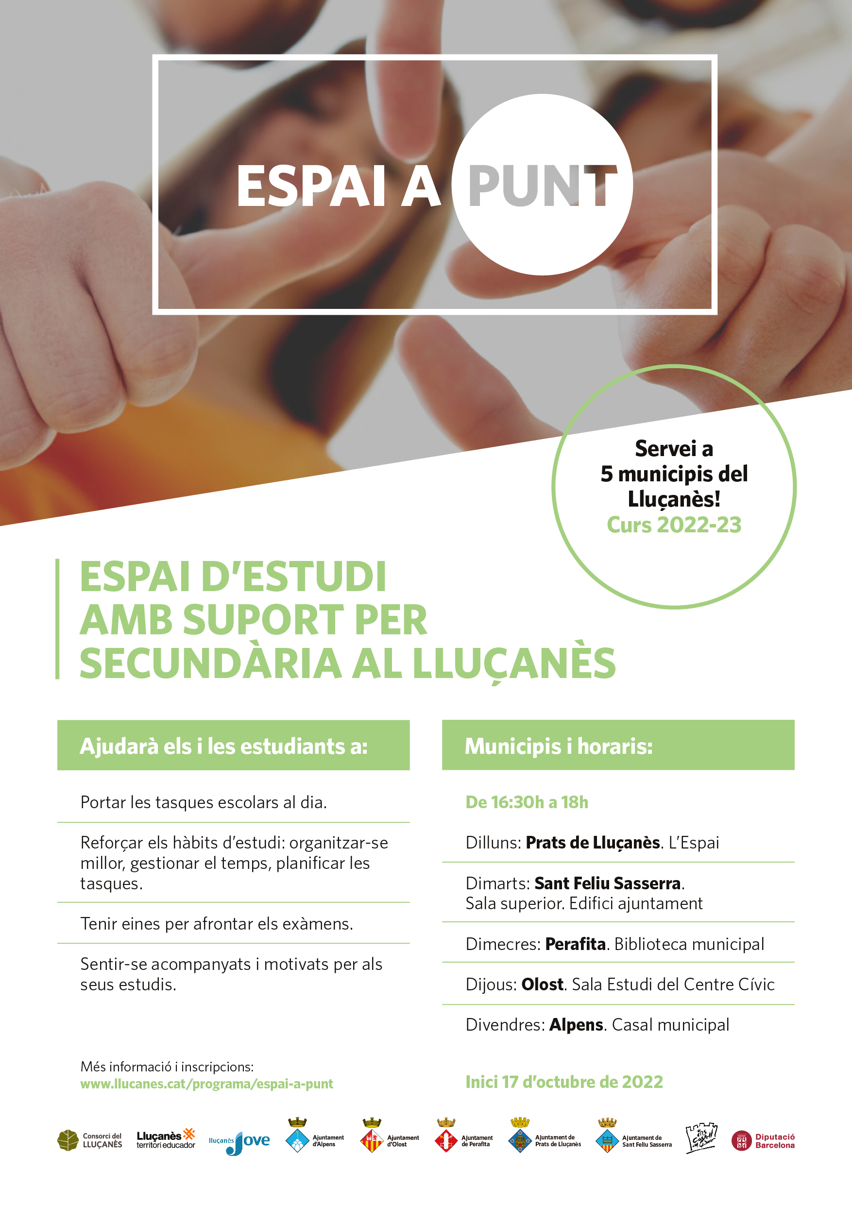 El Consorci del Lluçanès, el Servei de Joventut del Lluçanès i els ajuntaments de Olost, Perafita, Prats de Lluçanès, Sant Feliu Sasserra i Alpens engeguen la tercera edició del projecte adreçat als i a les estudiants d’educació secundària del Lluçanès: ‘l’Espai A Punt’. El projecte compte amb el suport econòmic de la Diputació de Barcelona i es construeix amb la col·laboració de l’Institut Castell del Quer, de Prats de Lluçanès.