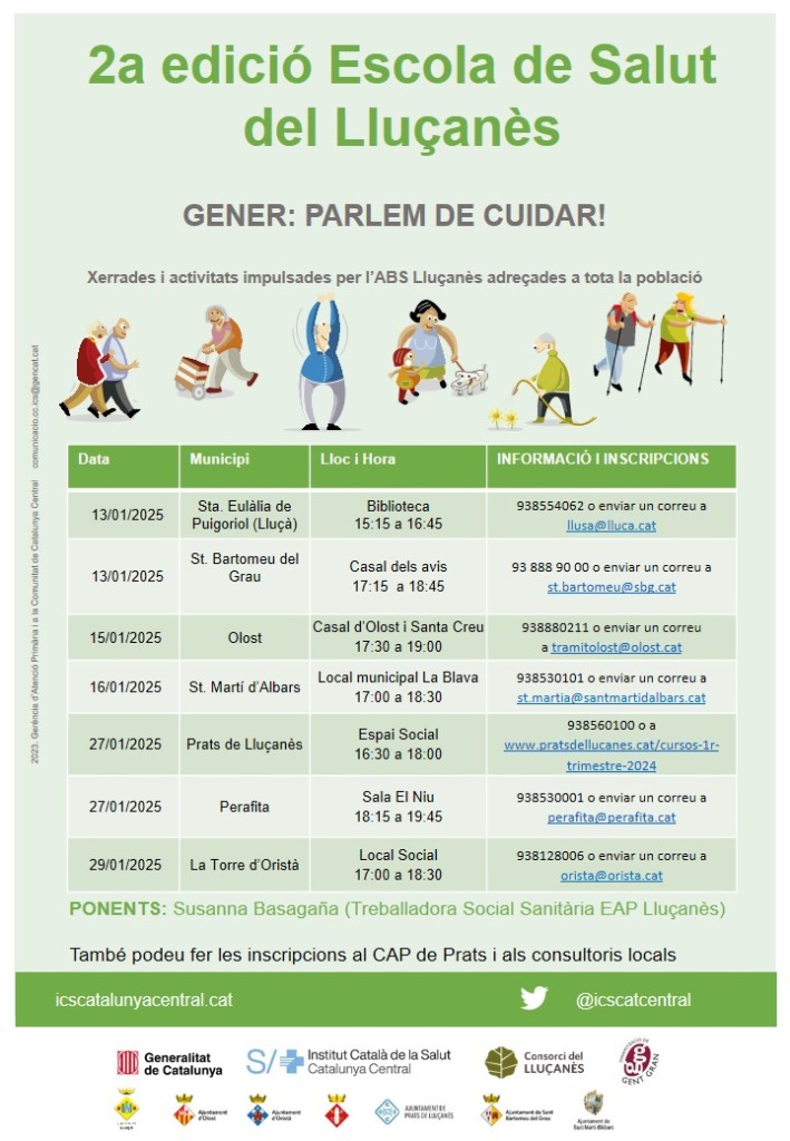Torna Escola de Salut, un projecte que va iniciar-se el gener del 2024 amb l’objectiu d’oferir tallers i xerrades sobre temes relacionats amb la salut en els pobles que formen part de l’Àrea Bàsica de Salut Lluçanès (Lluçà – Santa Eulàlia de Puig-oriol, Olost, Oristà i La Torre d´Oristà, Perafita, Prats de Lluçanès, Sant Bartomeu del Grau i Sant Martí d’Albars).