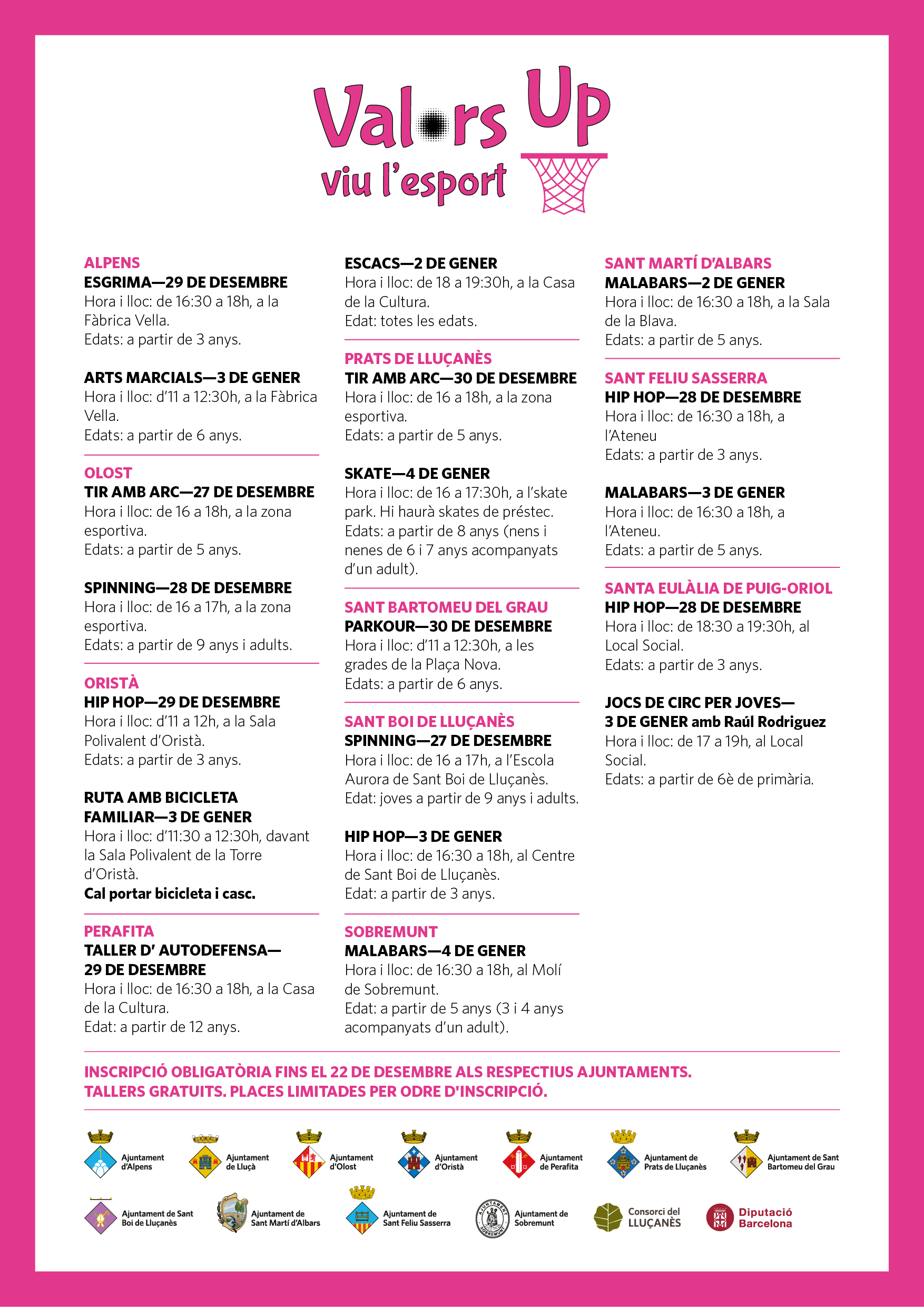 Les inscripcions es poden fer fins al dia 22 de desembre als respectius ajuntaments. Aquestes activitats formen part del projecte Valors Up, a través del qual es realitzen accions amb diferents agents esportius del territori (clubs, escoles, institut, pares i mares…) amb l’objectiu d’enriquir i educar amb valors, donar una bona qualitat esportiva al Lluçanès, evitar l’abandonament de la pràctica esportiva i facilitar l’accés a l’esport.