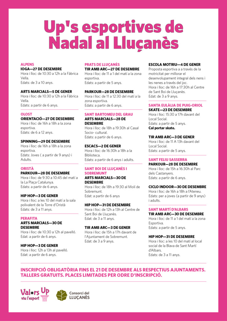 Les inscripcions es poden fer fins al dia 21 de desembre als respectius Ajuntaments. Aquestes activitats formen part del projecte Valors Up on es realitzen accions amb diferents agents esportius del territori (clubs, escoles, institut, pares i mares…) per enriquir i educar amb valors, per donar una bona qualitat esportiva al Lluçanès, evitar l’abandonament de la pràctica esportiva i facilitar l’accés a l’esport.