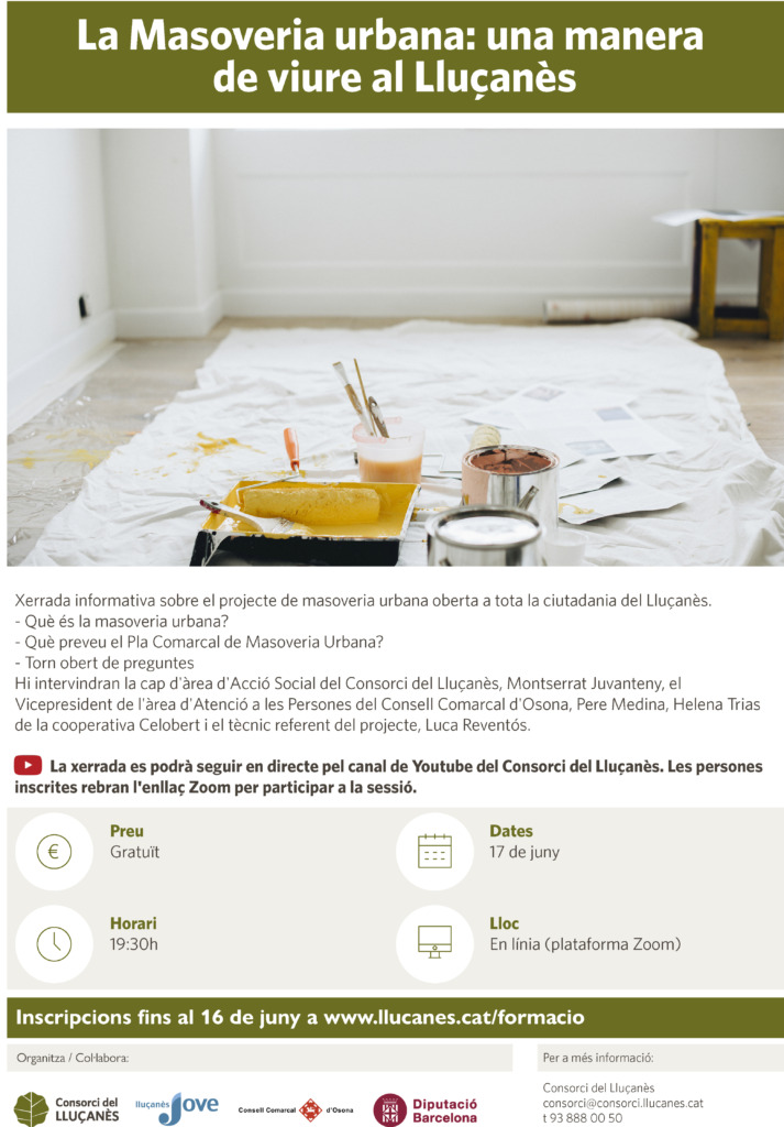 Amb l’objectiu de fer arribar tota aquesta informació a la ciutadania, el Consorci del Lluçanès organitza dijous vinent 17 de juny, a les 19:30h, una xerrada telemàtica per donar a conèixer el projecte de masoveria urbana al Lluçanès.